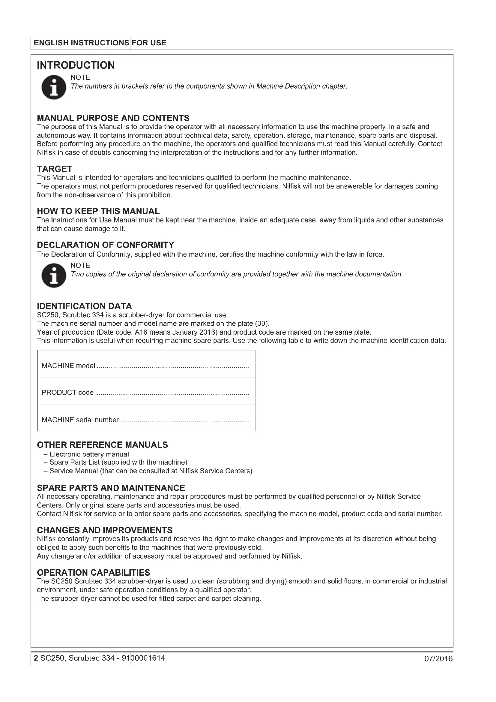 The Declaration of Conformity, supplied with the machine, certies the machine conformity with the law in force. NOTE Two copies of the original declaration of conformity are provided together with the machine documentation. IDENTIFICATION DATA SC250, Scrubtec 334 is a scrubber-dryer for commercial use. The machine serial number and model name are marked on the plate (30). Year of production (Date code: A16 means January 2016) and product code are marked on the same plate. This information is useful when requiring machine spare parts. Use the following table to write down the machine identication data. MACHINE model .............................................................................. PRODUCT code .............................................................................. MACHINE serial number .................................................................