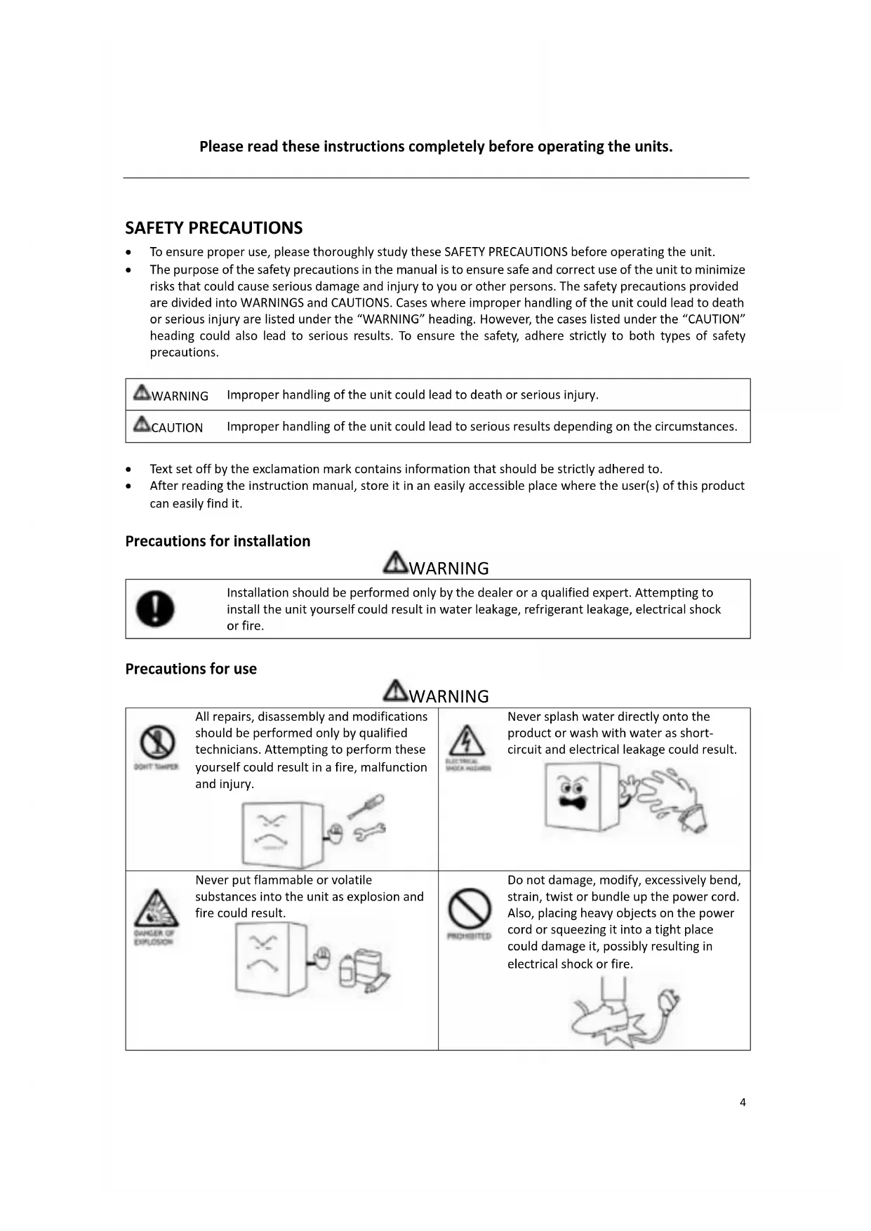 Installation should be performed only by the dealer or a qualified expert. Attempting to install the unit yourself could result in water leakage, refrigerant leakage, electrical shock or fire.