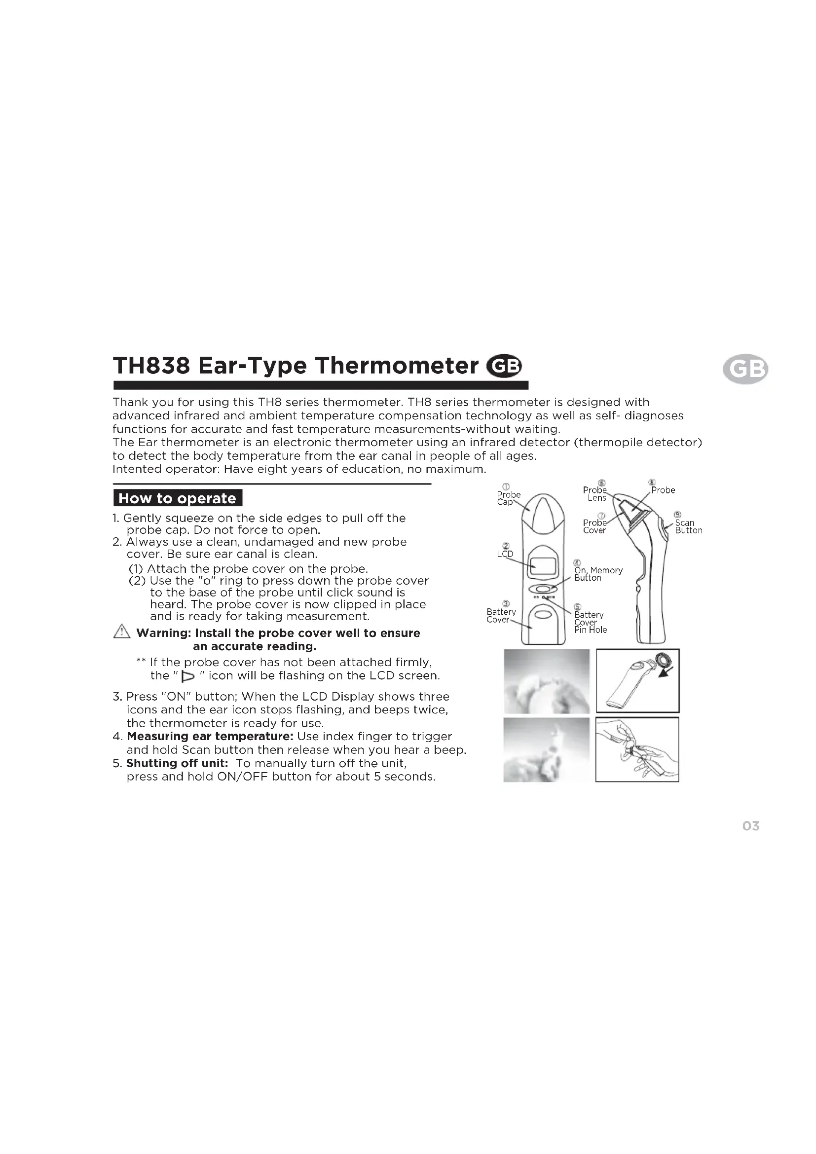 TH838 Ear-Type Thermometer Thank you for using this TH8 series thermometer. TH8 series thermometer is designed with advanced infrared and ambient temperature compensation technology as well as self- diagnoses functions for accurate and fast temperature measurements-without waiting.The Ear thermometer is an electronic thermometer using an infrared detector (thermopile detector) to detect the body temperature from the ear canal in people of all ages. Intented operator: Have eight years of education, no maximum.1. Gently squeeze on the side edges to pull off the probe cap. Do not force to open.2. Always use a clean, undamaged and new probe cover. Be sure ear canal is clean.(1) Attach the probe cover on the probe.(2) Use the "o" ring to press down the probe cover to the base of the probe until click sound is heard. The probe cover is now clipped in place and is ready for taking measurement.Warning: Install the probe cover well to ensure an accurate reading.** If the probe cover has not been attached firmly, the " " icon will be flashing on the LCD screen.3. Press "ON" button; When the LCD Display shows three icons and the ear icon stops flashing, and beeps twice, the thermometer is ready for use.