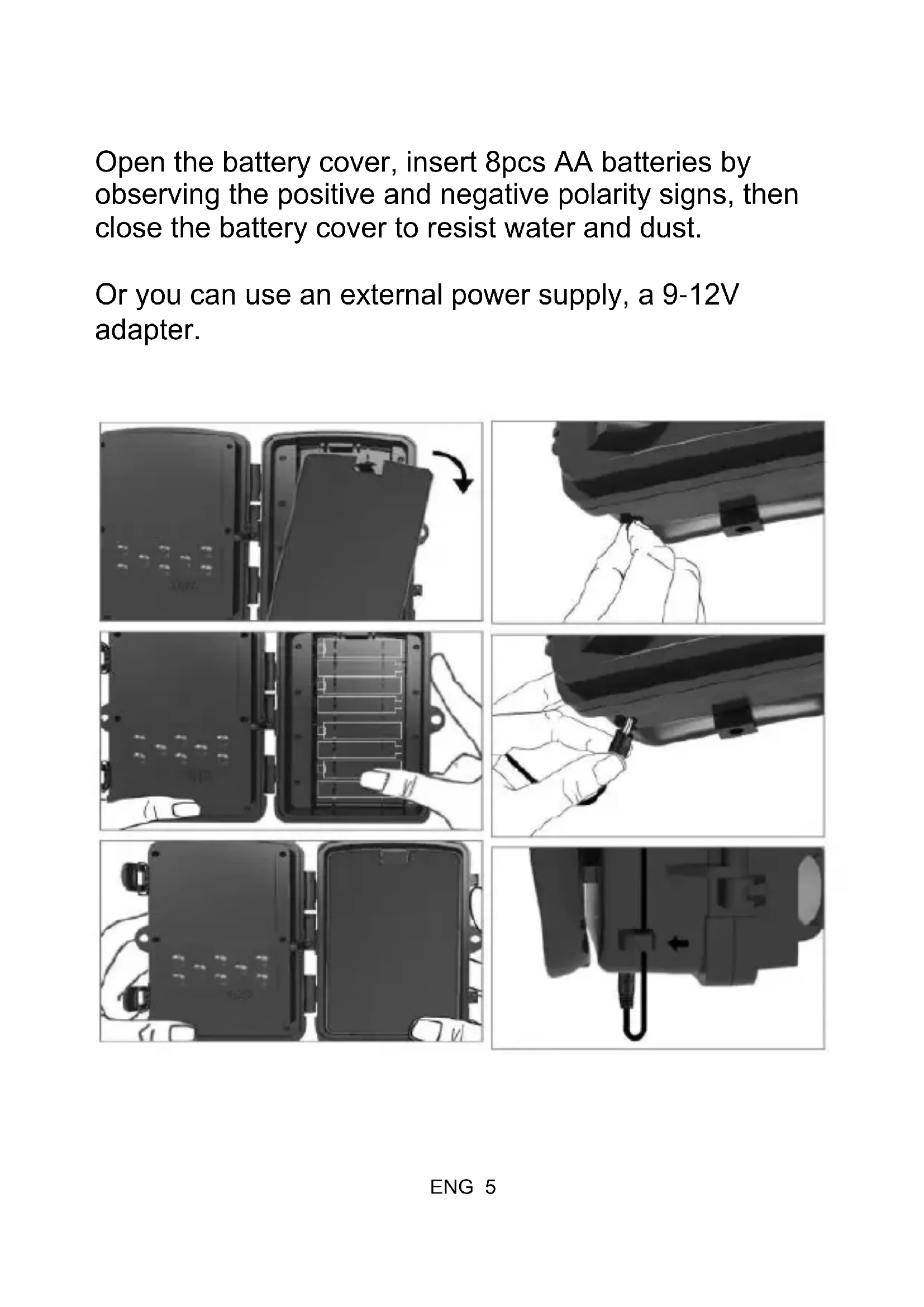8*AA Battery Depot Setup Buttons Color Display Screen SIM Card Slot USB Port Mode Switch MicroSD Card Slot Stand Knob PortENG 5 Open the battery cover, insert 8pcs AA batteries by observing the positive and negative polarity signs, then close the battery cover to resist water and dust. Or you can use an external power supply, a 9-12V adapter.ENG 6 APP Download