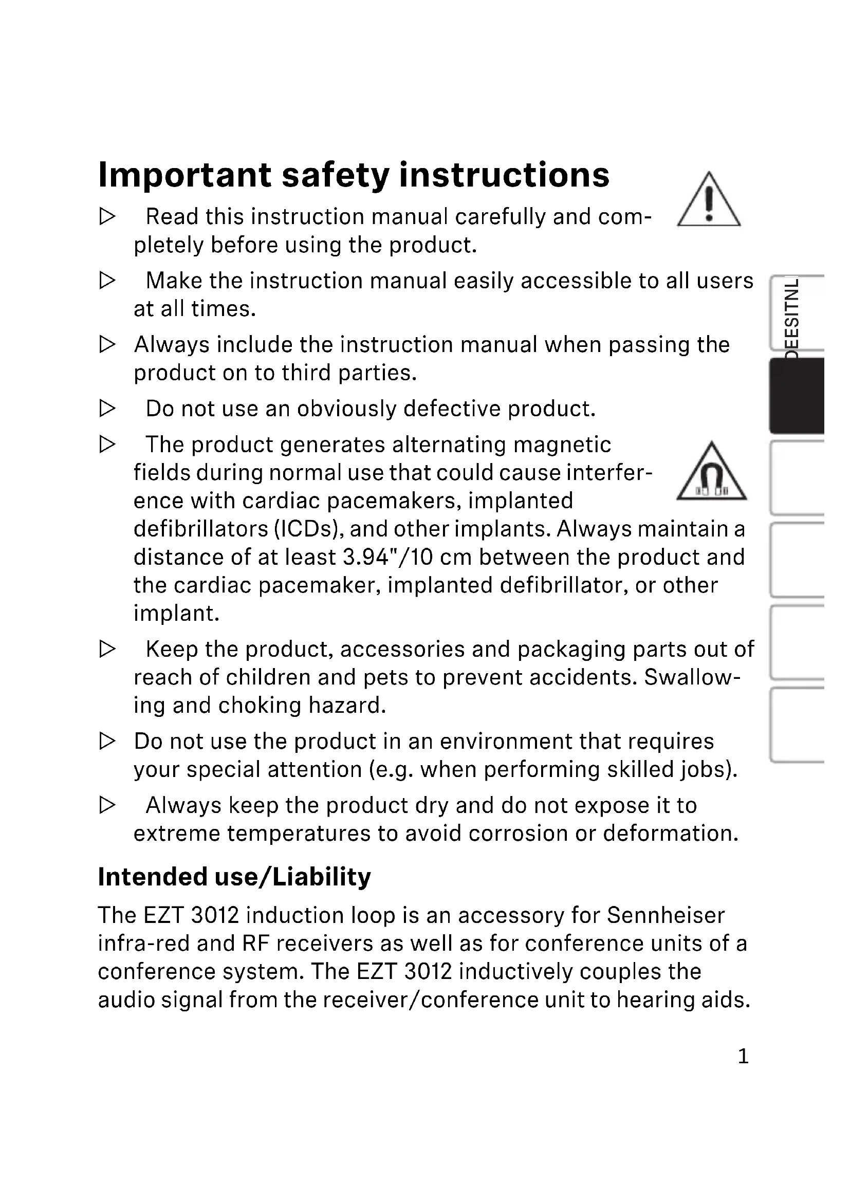 Important safety instructions ▷ Read this instruction manual carefully and com- pletely before using the product. ▷ Make the instruction manual easily accessible to all users at all times. ▷ Always include the instruction manual when passing the product on to third parties. ▷ Do not use an obviously defective product. ▷ The product generates alternating magnetic fields during normal use that could cause interfer- ence with cardiac pacemakers, implanted defibrillators (ICDs), and other implants. Always maintain a distance of at least 3.94"/10 cm between the product and the cardiac pacemaker, implanted defibrillator, or other implant. ▷ Keep the product, accessories and packaging parts out of reach of children and pets to prevent accidents. Swallow- ing and choking hazard. ▷ Do not use the product in an environment that requires your special attention (e.g. when performing skilled jobs). ▷ Always keep the product dry and do not expose it to extreme temperatures to avoid corrosion or deformation. Intended use/Liability The EZT 3012 induction loop is an accessory for Sennheiser infra-red and RF receivers as well as for conference units of a conference system. The EZT 3012 inductively couples the audio signal from the receiver/conference unit to hearing aids. EZT_3012_532880_0421_SP6.book Seite 1 Mittwoch, 5. Mai 2021 6:46 062 It is considered improper use when the product is used for any application not named in the corresponding product docu- mentation. Sennheiser does not accept liability for damage arising from misuse or improper use of this product and its attachments/ accessories. Before putting the product into operation, please observe the respective country-specific regulations. Package contents 1 EZT 3012 induction loop 1 instruction manual Using the EZT 3012 CAUTION Danger due to magnetic fields! If you connect the EZT 3012 to devices that are not designed for use with the induction loop, magnetic fields can be generated that could cause dangerous interference with cardiac pacemakers, implanted defibrillators (ICDs), and other implants. ▷ Only connect the induction loop to Sennheiser devices. EZT_3012_532880_0421_SP6.book Seite 2 Mittwoch, 5. Mai 2021 6:46 063