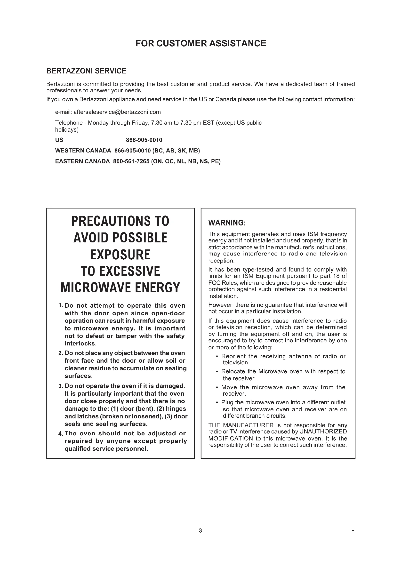 This equipment generates and uses ISM frequency energy and if not installed and used properly, that is in strict accordance with the manufacturer's instructions, may cause interference to radio and television reception.It has been type-tested and found to comply with limits for an ISM Equipment pursuant to part 18 of FCC Rules, which are designed to provide reasonable protection against such interference in a residential installation.However, there is no guarantee that interference will not occur in a particular installation.If this equipment does cause interference to radio or television reception, which can be determined by turning the equipment off and on, the user is encouraged to try to correct the interference by one or more of the following:• Reorient the receiving antenna of radio or television.• Relocate the Microwave oven with respect to the receiver.• Move the microwave oven away from the receiver.• Plug the microwave oven into a different outlet so that microwave oven and receiver are on different branch circuits.THE MANUFACTURER is not responsible for any radio or TV interference caused by UNAUTHORIZED MODIFICATION to this microwave oven. It is the responsibility of the user to correct such interference. BERTAZZONI SERVICE Bertazzoni is committed to providing the best customer and product service. We have a dedicated team of trained professionals to answer your needs.If you own a Bertazzoni appliance and need service in the US or Canada please use the following contact information:e-mail: aftersaleservice@bertazzoni.comTelephone - Monday through Friday, 7:30 am to 7:30 pm EST (except US public holidays)US 866-905-0010 WESTERN CANADA 866-905-0010 (BC, AB, SK, MB)EASTERN CANADA 800-561-7265 (ON, QC, NL, NB, NS, PE)