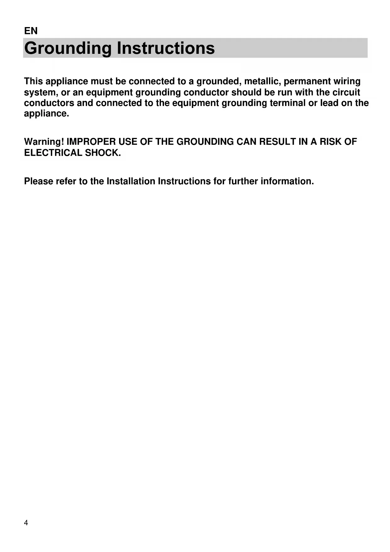 Grounding Instructions This appliance must be connected to a grounded, metallic, permanent wiring system, or an equipment grounding conductor should be run with the circuit conductors and connected to the equipment grounding terminal or lead on the appliance. Warning! IMPROPER USE OF THE GROUNDING CAN RESULT IN A RISK OF ELECTRICAL SHOCK. Please refer to the Installation Instructions for further information.5