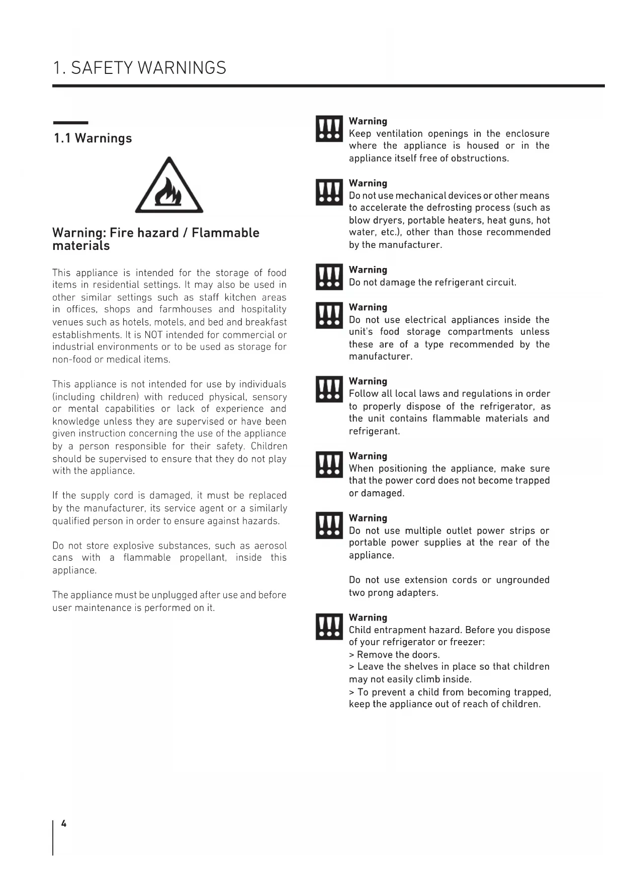 materials This appliance is intended for the storage of food items in residential settings. It may also be used in other similar settings such as sta kitchen areas in oces, shops and farmhouses and hospitality venues such as hotels, motels, and bed and breakfast establishments. It is NOT intended for commercial or industrial environments or to be used as storage for non-food or medical items. This appliance is not intended for use by individuals (including children) with reduced physical, sensory or mental capabilities or lack of experience and knowledge unless they are supervised or have been given instruction concerning the use of the appliance by a person responsible for their safety. Children should be supervised to ensure that they do not play with the appliance. If the supply cord is damaged, it must be replaced by the manufacturer, its service agent or a similarly qualified person in order to ensure against hazards. Do not store explosive substances, such as aerosol cans with a flammable propellant, inside this appliance. The appliance must be unplugged after use and before user maintenance is performed on it. Warning Keep ventilation openings in the enclosure where the appliance is housed or in the appliance itself free of obstructions. Warning Do not use mechanical devices or other means to accelerate the defrosting process (such as blow dryers, portable heaters, heat guns, hot water, etc.), other than those recommended by the manufacturer. Warning Do not damage the refrigerant circuit. Warning Do not use electrical appliances inside the unit's food storage compartments unless these are of a type recommended by the manufacturer. Warning Follow all local laws and regulations in order to properly dispose of the refrigerator, as the unit contains flammable materials and refrigerant. Warning When positioning the appliance, make sure that the power cord does not become trapped or damaged. Warning Do not use multiple outlet power strips or portable power supplies at the rear of the appliance. Do not use extension cords or ungrounded two prong adapters. Warning Child entrapment hazard. Before you dispose of your refrigerator or freezer: > Remove the doors. > Leave the shelves in place so that children may not easily climb inside. > To prevent a child from becoming trapped, keep the appliance out of reach of children.5