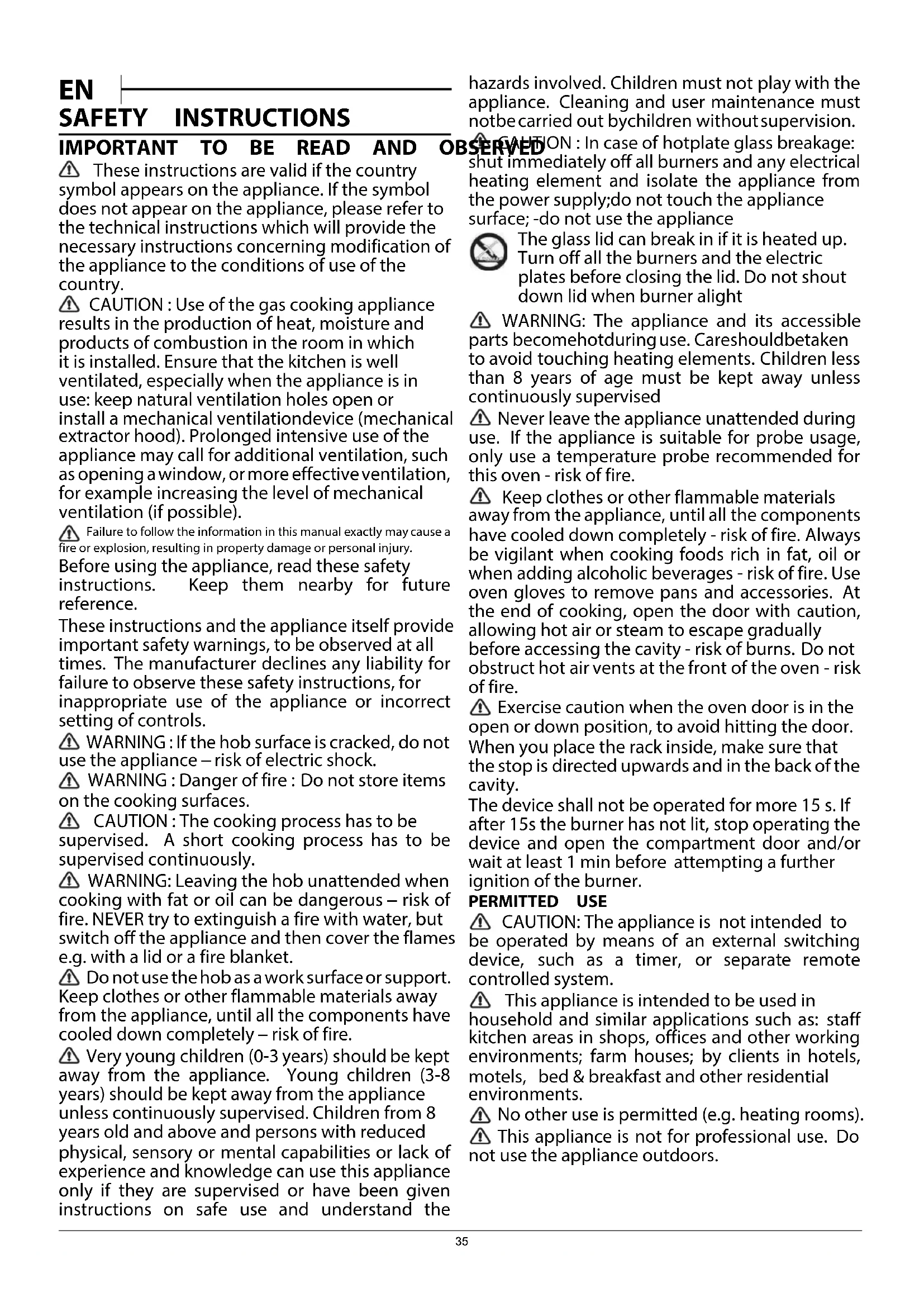 These instructions are valid if the country symbol appears on the appliance. If the symbol does not appear on the appliance, please refer to the technical instructions which will provide the necessary instructions concerning modification of the appliance to the conditions of use of the country. CAUTION : Use of the gas cooking appliance results in the production of heat, moisture and products of combustion in the room in which it is installed. Ensure that the kitchen is well ventilated, especially when the appliance is in use: keep natural ventilation holes open or install a mechanical ventilationdevice (mechanical extractor hood). Prolonged intensive use of the appliance may call for additional ventilation, such asopeningawindow,ormoreeffectiveventilation, for example increasing the level of mechanical ventilation (if possible). Failure to follow the information in this manual exactly may cause a fire or explosion, resulting in property damage or personal injury. Before using the appliance, read these safety instructions. Keep them nearby for future reference. These instructions and the appliance itself provide important safety warnings, to be observed at all times. The manufacturer declines any liability for failure to observe these safety instructions, for inappropriate use of the appliance or incorrect setting of controls.