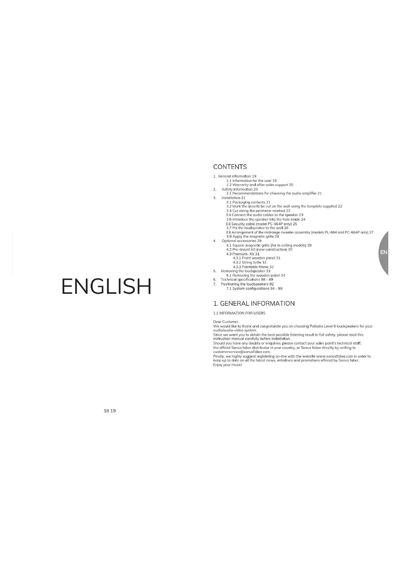 Dear Customer, We would like to thank and congratulate you on choosing Palladio Level 6 loudspeakers for your audio/audio-video system. Since we want you to obtain the best possible listening result in full safety, please read this instruction manual carefully before installation. Should you have any doubts or enquiries, please contact your sales point’s technical staff, the ofcial Sonus faber distributor in your country, or Sonus faber directly by writing to customerservice@sonusfaber.com. Finally, we highly suggest registering on-line with the website www.sonusfaber.com in order to keep up to date on all the latest news, initiatives and promotions offered by Sonus faber. Enjoy your music!