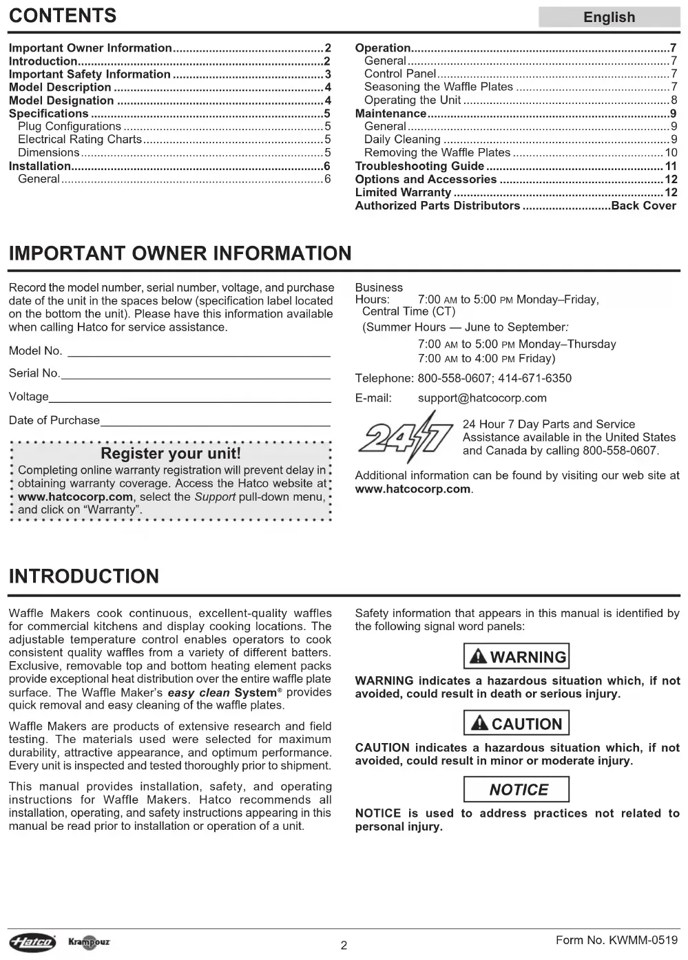 Record the model number, serial number, voltage, and purchase date of the unit in the spaces below (specification label located on the bottom the unit). Please have this information available when calling Hatco for service assistance. Model No. ________________________________________ Serial No. _________________________________________ Voltage ___________________________________________ Date of Purchase ___________________________________ Register your unit! Completing online warranty registration will prevent delay in obtaining warranty coverage. Access the Hatco website at www.hatcocorp.com, select the Support pull-down menu, and click on “Warranty”. Business Hours: 7:00 am to 5:00 pm Monday–Friday, Central Time (CT) (Summer Hours — June to September: 7:00 am to 5:00 pm Monday–Thursday 7:00 am to 4:00 pm Friday) Telephone: 800-558-0607; 414-671-6350 E-mail: support@hatcocorp.com 24 Hour 7 Day Parts and Service Assistance available in the United States and Canada by calling 800-558-0607. Additional information can be found by visiting our web site at www.hatcocorp.com. CONTENTSForm No. KWMM-0519
