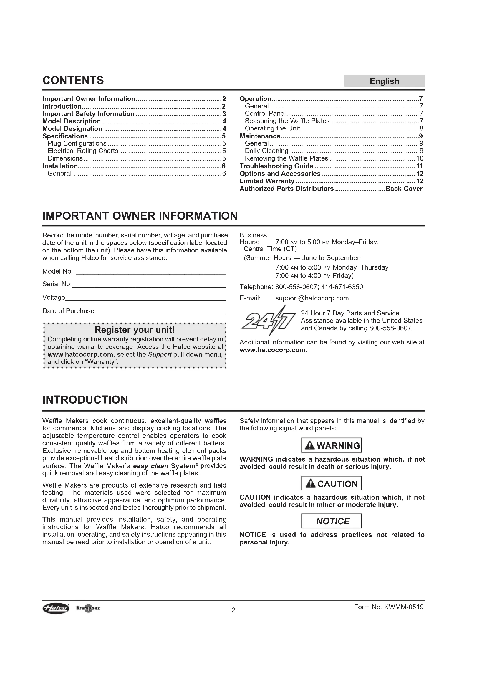 Record the model number, serial number, voltage, and purchase date of the unit in the spaces below (specification label located on the bottom the unit). Please have this information available when calling Hatco for service assistance. Model No. ________________________________________ Serial No. _________________________________________ Voltage ___________________________________________ Date of Purchase ___________________________________ Register your unit! Completing online warranty registration will prevent delay in obtaining warranty coverage. Access the Hatco website at www.hatcocorp.com, select the Support pull-down menu, and click on “Warranty”. Business Hours: 7:00 am to 5:00 pm Monday–Friday, Central Time (CT) (Summer Hours — June to September: 7:00 am to 5:00 pm Monday–Thursday 7:00 am to 4:00 pm Friday) Telephone: 800-558-0607; 414-671-6350 E-mail: support@hatcocorp.com 24 Hour 7 Day Parts and Service Assistance available in the United States and Canada by calling 800-558-0607. Additional information can be found by visiting our web site at www.hatcocorp.com. CONTENTSForm No. KWMM-0519