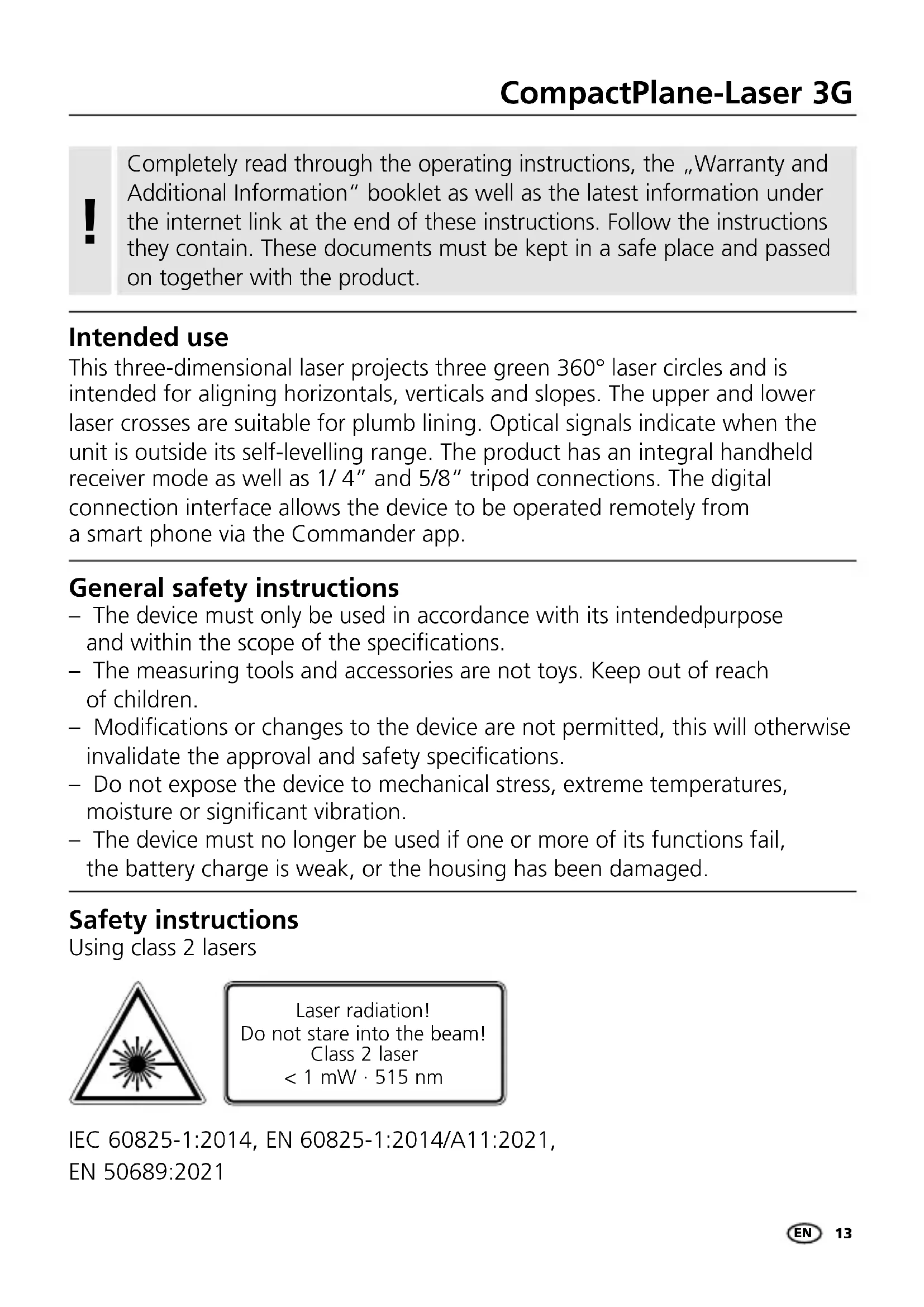 Intended use This three-dimensional laser projects three green 360° laser circles and is intended for aligning horizontals, verticals and slopes. The upper and lower laser crosses are suitable for plumb lining. Optical signals indicate when the unit is outside its self-levelling range. The product has an integral handheld receiver mode as well as 1/ 4” and 5/8“ tripod connections. The digital connection interface allows the device to be operated remotely from a smart phone via the Commander app. General safety instructions – The device must only be used in accordance with its intendedpurpose and within the scope of the specications. – The measuring tools and accessories are not toys. Keep out of reach of children. – Modications or changes to the device are not permitted, this will otherwise invalidate the approval and safety specications. – Do not expose the device to mechanical stress, extreme temperatures, moisture or signicant vibration. – The device must no longer be used if one or more of its functions fail, the battery charge is weak, or the housing has been damaged. Safety instructions Using class 2 lasers