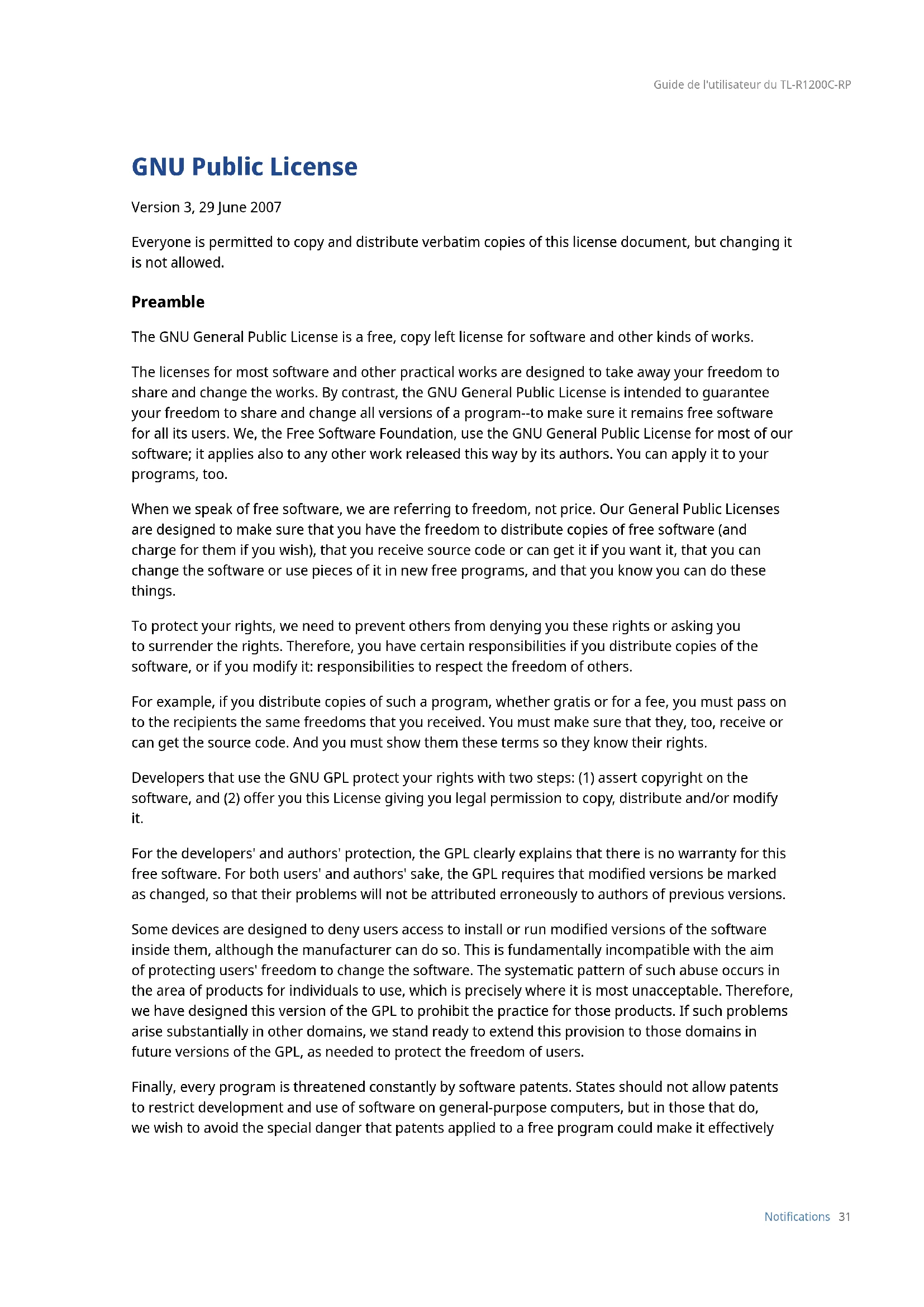A “contributor” is a copyright holder who authorizes use under this License of the Program or a work on which the Program is based. The work thus licensed is called the contributor's “contributor version”. A contributor's “essential patent claims” are all patent claims owned or controlled by the contributor, whether already acquired or hereafter acquired, that would be infringed by some manner, permitted by this License, of making, using, or selling its contributor version, but do not include claims that would be infringed only as a consequence of further modication of the contributor version. For purposes of this denition, “control” includes the right to grant patent sublicenses in a manner consistent with the requirements of this License. Each contributor grants you a non-exclusive, worldwide, royalty-free patent license under the contributor's essential patent claims, to make, use, sell, oer for sale, import and otherwise run, modify and propagate the contents of its contributor version. In the following three paragraphs, a “patent license” is any express agreement or commitment, however denominated, not to enforce a patent (such as an express permission to practice a patent or covenant not to sue for patent infringement). To “grant” such a patent license to a party means to make such an agreement or commitment not to enforce a patent against the party. If you convey a covered work, knowingly relying on a patent license, and the Corresponding Source of the work is not available for anyone to copy, free of charge and under the terms of this License, through a publicly available network server or other readily accessible means, then Guide de l'utilisateur du TL-R1200C-RP Notications 37you must either (1) cause the Corresponding Source to be so available, or (2) arrange to deprive yourself of the benet of the patent license for this particular work, or (3) arrange, in a manner consistent with the requirements of this License, to extend the patent license to downstream recipients. “Knowingly relying” means you have actual knowledge that, but for the patent license, your conveying the covered work in a country, or your recipient's use of the covered work in a country, would infringe one or more identiable patents in that country that you have reason to believe are valid. If, pursuant to or in connection with a single transaction or arrangement, you convey, or propagate by procuring conveyance of, a covered work, and grant a patent license to some of the parties receiving the covered work authorizing them to use, propagate, modify or convey a specic copy of the covered work, then the patent license you grant is automatically extended to all recipients of the covered work and works based on it. A patent license is “discriminatory” if it does not include within the scope of its coverage, prohibits the exercise of, or is conditioned on the non-exercise of one or more of the rights that are specically granted under this License. You may not convey a covered work if you are a party to an arrangement with a third party that is in the business of distributing software, under which you make payment to the third party based on the extent of your activity of conveying the work, and under which the third party grants, to any of the parties who would receive the covered work from you, a discriminatory patent license (a) in connection with copies of the covered work conveyed by you (or copies made from those copies), or (b) primarily for and in connection with specic products or compilations that contain the covered work, unless you entered into that arrangement, or that patent license was granted, prior to 28 March 2007. Nothing in this License shall be construed as excluding or limiting any implied license or other defenses to infringement that may otherwise be available to you under applicable patent law.