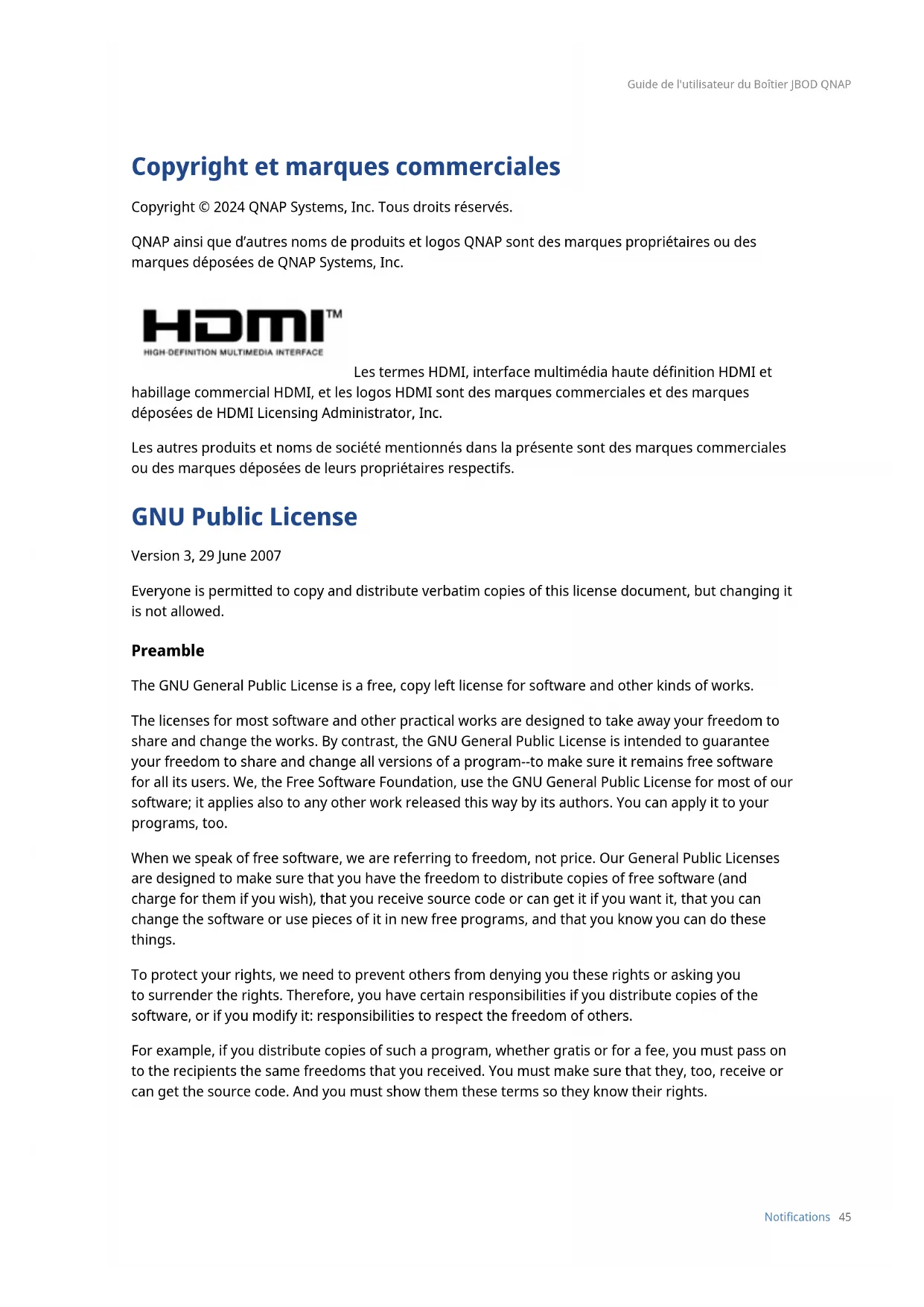 No covered work shall be deemed part of an eective technological measure under any applicable law fullling obligations under article 11 of the WIPO copyright treaty adopted on 20 December 1996, or similar laws prohibiting or restricting circumvention of such measures. When you convey a covered work, you waive any legal power to forbid circumvention of technological measures to the extent such circumvention is eected by exercising rights under Guide de l'utilisateur du Boîtier JBOD QNAP Notications 47this License with respect to the covered work, and you disclaim any intention to limit operation or modication of the work as a means of enforcing, against the work's users, your or third parties' legal rights to forbid circumvention of technological measures.