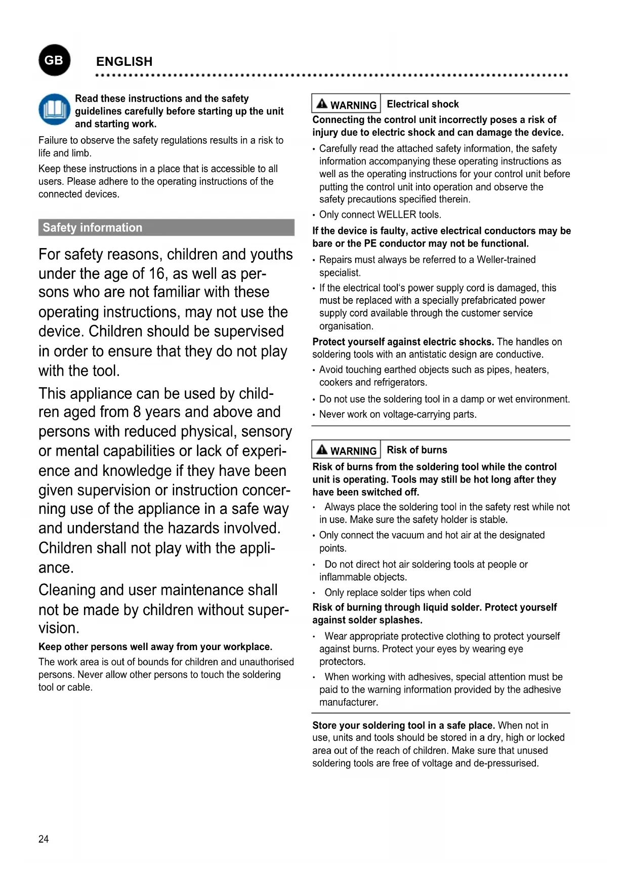 - Keep all combustible objects, liquids or gases well away from the hot soldering tool. The mains cable must only be plugged into the mains socket or adapter approved for this purpose. Checkto seeifthemainsvoltagematchestheratingsonthe nameplate.Makesurethemachineisswitchedobefore pluggingin. Do not use the cable for purposes other than those for which it is intended.Never carry the unit by the cable. Do not use the cable to pull the plug out of the socket. Protect the cable against heat, oil and sharp edges.. Be alert. Pay attention to what you are doing. Be smart when using the unit. Do not use the soldering tool if you are having difculty concentrating. Avoid abnormal posture. Arrange your work station in an ergonomically correct way. Avoid bad posture when using the unit, as this can lead to postural problems. The soldering tool must be operated only in perfect technical working order. Safety devices must not be deactivated. Faults and defects must be repaired immediately. Before using the unit / tool, safety devices must be carefully checked to make sure that they are functioning properly and in the manner intended. Check that moving parts are func- tioning properly and are not sticking, and whether parts are damaged. All parts must be correctly tted and must satisfy all the requirements necessary to guarantee troublefree operation of the unit. Use the correct tool. Use only accessories or auxiliary de- vices which are included in the list of accessories or appro- ved for use by the manufacturer. Use WELLER accessories or auxiliary devices on original WELLER equipment only. The use of other tools and other accessories can cause injury. Secure the tool. Use clamping xtures to hold the workpiece. Use a solder fume extraction unit. If appliances for connecting solder fume extraction units are available, ensure that they are connected and used properly. Specied Conditions Of Use Supply unit for WELLER WX soldering tools. Use the solde- ring station / desoldering station / hot air station exclusively for the purpose indicated in the operating instructions of sol- dering and desoldering under the conditions specied herein. WARNING Flammable gases and liquids may not be extracted. The device may only be used with correctly tted and suitable lter cartridges. Replace lter cartridges when full. This device may only be used at room temperature and indoors. Protect against moisture and direct sunlight. User groups Due to differing degrees of risk and potential hazards, sever- al work steps may only be performed by trained experts. Work step User groups Default soldering para- meters Specialist personnel with technical training Replacing electrical repla- cement parts Electricians Default maintenance intervals Safety expert Operation Filter change Non-specialists Operation Filter change Replacing electrical repla- cement parts Technical trainees under the guidance and supervision of a trained expert Care and maintenance WARNING Before doing any work on the machine, pull the plug out of the socket. Leave the unit to cool down. Clean the operator panel, if dirty, using a suitable cleaning cloth. Seal ports which are not in use with covering caps. Check all connected cables and hoses on a regular basis. If power tools are damaged, they must be immediately removed from use. WARNING Risk of burns