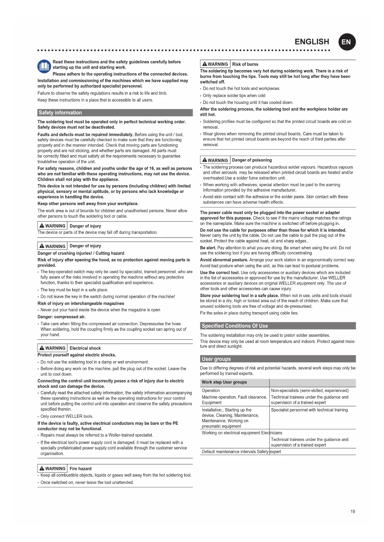 - Avoid skin contact with the adhesive or the solder paste. Skin contact with these substances can have adverse health effects. The power cable must only be plugged into the power socket or adapter approved for this purpose. Check to see if the mains voltage matches the ratings on the nameplate. Make sure the machine is switched o before plugging in. Do not use the cable for purposes other than those for which it is intended. Nevercarrytheunitbythecable.Donotusethecabletopulltheplugoutofthe socket. Protect the cable against heat, oil and sharp edges.. Be alert. Payattentiontowhatyouaredoing.Besmartwhenusingtheunit.Donot usethesolderingtoolifyouarehavingdifcultyconcentrating. Avoid abnormal posture. Arrangeyourworkstationinanergonomicallycorrectway. Avoid bad posture when using the unit, as this can lead to postural problems. Use the correct tool. Useonlyaccessoriesorauxiliarydeviceswhichareincluded inthelistofaccessoriesorapprovedforusebythemanufacturer.UseWELLER accessoriesorauxiliarydevicesonoriginalWELLERequipmentonly.Theuseof othertoolsandotheraccessoriescancauseinjury. Store your soldering tool in a safe place. When not in use, units and tools should bestoredinadry,highorlockedareaoutofthereachofchildren.Makesurethat unused soldering tools are free of voltage and de-pressurised. Fix the axles in place during transport using cable ties. Specied Conditions Of Use Thesolderinginstallationmayonlybeusedtopistonsolderassemblies. Thisdevicemayonlybeusedatroomtemperatureandindoors.Protectagainstmois- ture and direct sunlight. User groups Duetodifferingdegreesofriskandpotentialhazards,severalworkstepsmayonlybe performedbytrainedexperts. Work step User groups Operation Machine operation, Fault clearance, Equipment Non-specialists (semi-skilled, experienced) Technical trainees under the guidance and supervision of a trained expert Installation., Starting up the device, Cleaning, Maintenance, Maintenance, Working on pneumatic equipment Specialist personnel with technical training Working on electrical equipment Electricians Technical trainees under the guidance and supervision of a trained expert Default maintenance intervals Safetyexpert