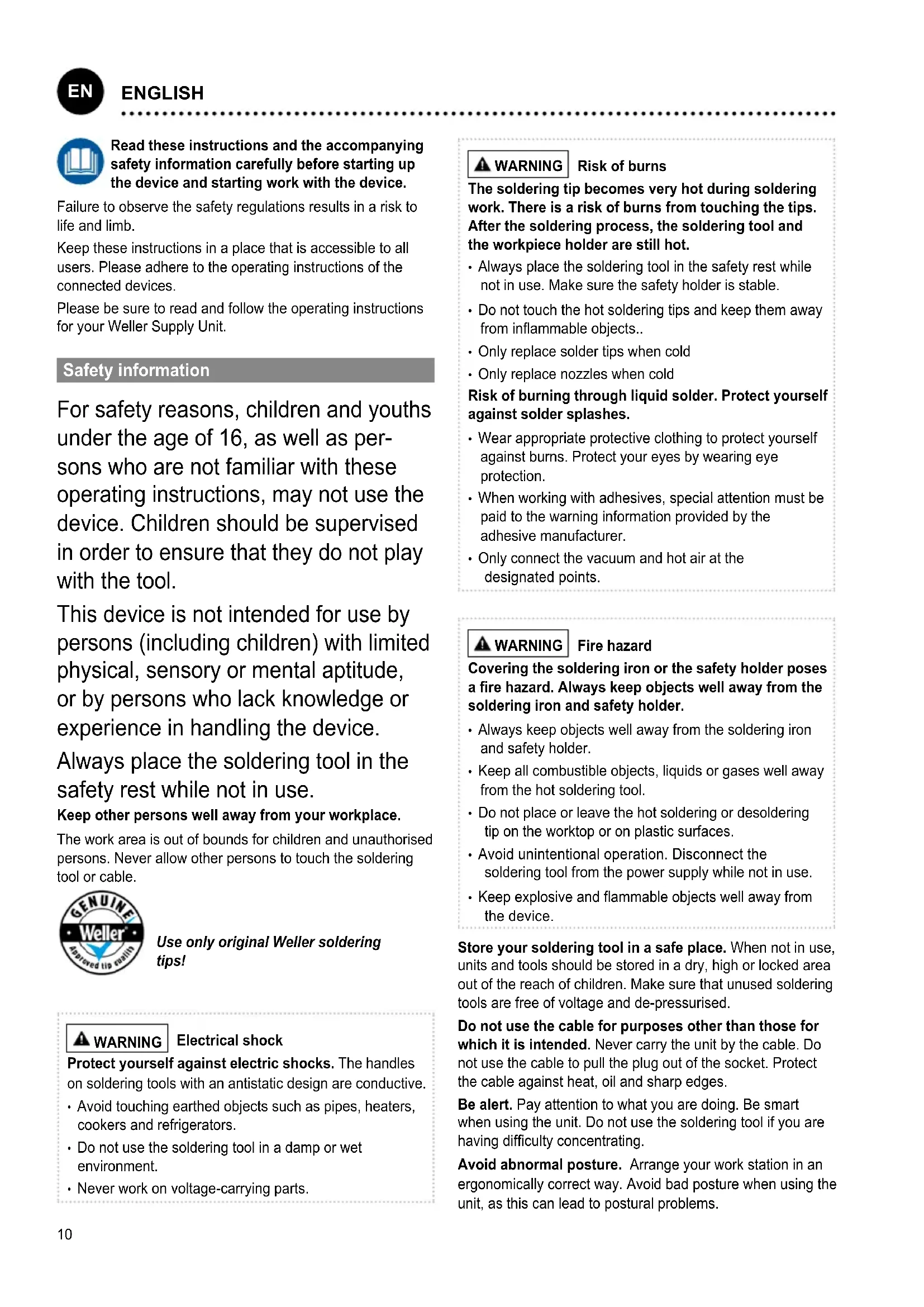 DEUTSCH10 Read these instructions and the accompanying safety information carefully before starting up the device and starting work with the device. Failure to observe the safety regulations results in a risk to life and limb. Keep these instructions in a place that is accessible to all users. Please adhere to the operating instructions of the connected devices. Please be sure to read and follow the operating instructions for your Weller Supply Unit. Safety information For safety reasons, children and youths under the age of 16, as well as per- sons who are not familiar with these operating instructions, may not use the device. Children should be supervised in order to ensure that they do not play with the tool. This device is not intended for use by persons (including children) with limited physical, sensory or mental aptitude, or by persons who lack knowledge or experience in handling the device. Always place the soldering tool in the safety rest while not in use. Keep other persons well away from your workplace. The work area is out of bounds for children and unauthorised persons. Never allow other persons to touch the soldering tool or cable. Use only original Weller soldering tips! WARNING Electrical shock Protect yourself against electric shocks. The handles on soldering tools with an antistatic design are conductive.