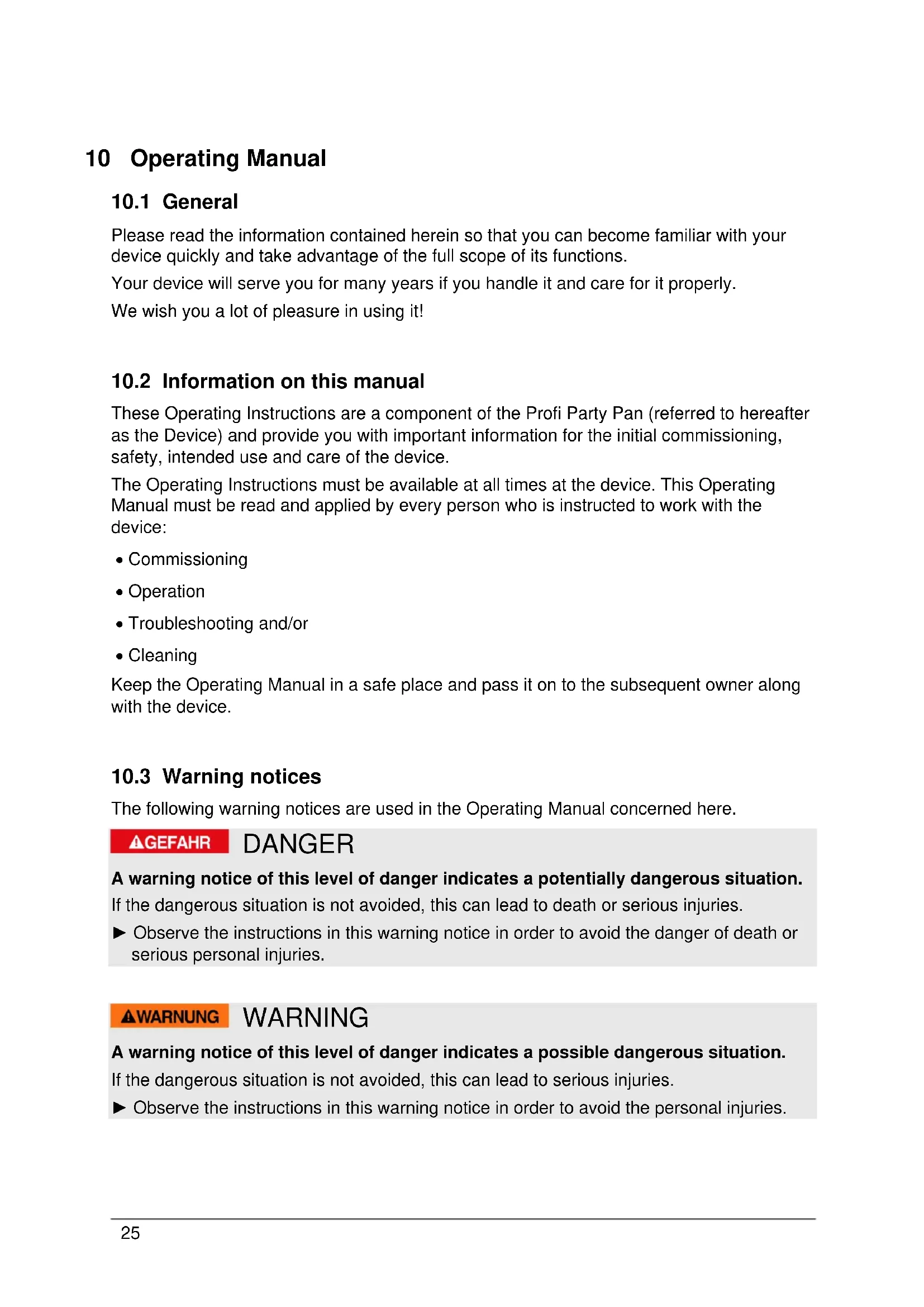 These Operating Instructions are a component of the Profi Party Pan (referred to hereafter as the Device) and provide you with important information for the initial commissioning, safety, intended use and care of the device. The Operating Instructions must be available at all times at the device. This Operating Manual must be read and applied by every person who is instructed to work with the device:
