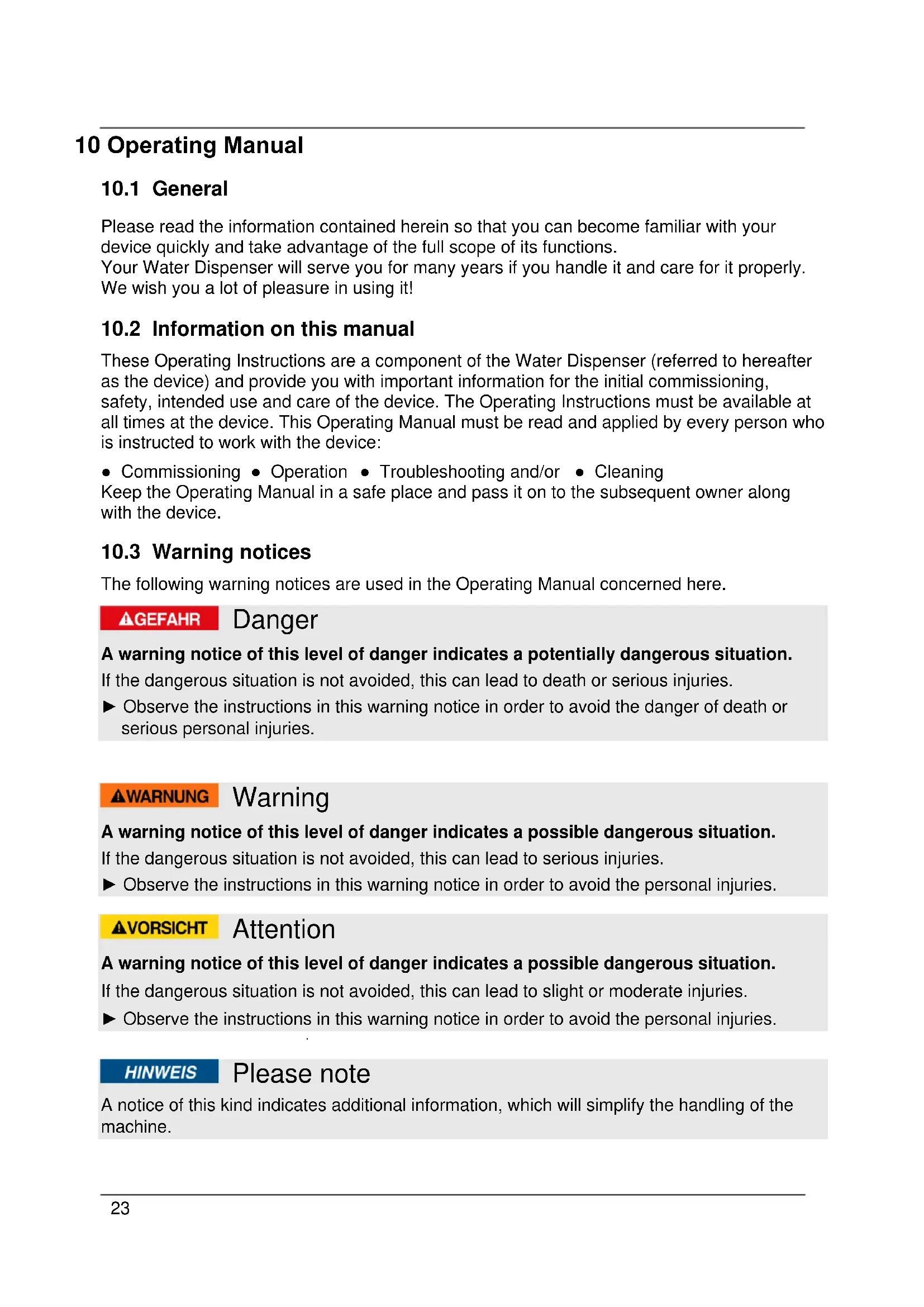 These Operating Instructions are a component of the Water Dispenser (referred to hereafter as the device) and provide you with important information for the initial commissioning, safety, intended use and care of the device. The Operating Instructions must be available at all times at the device. This Operating Manual must be read and applied by every person who is instructed to work with the device: ● Commissioning ● Operation ● Troubleshooting and/or ● Cleaning Keep the Operating Manual in a safe place and pass it on to the subsequent owner along with the device.
