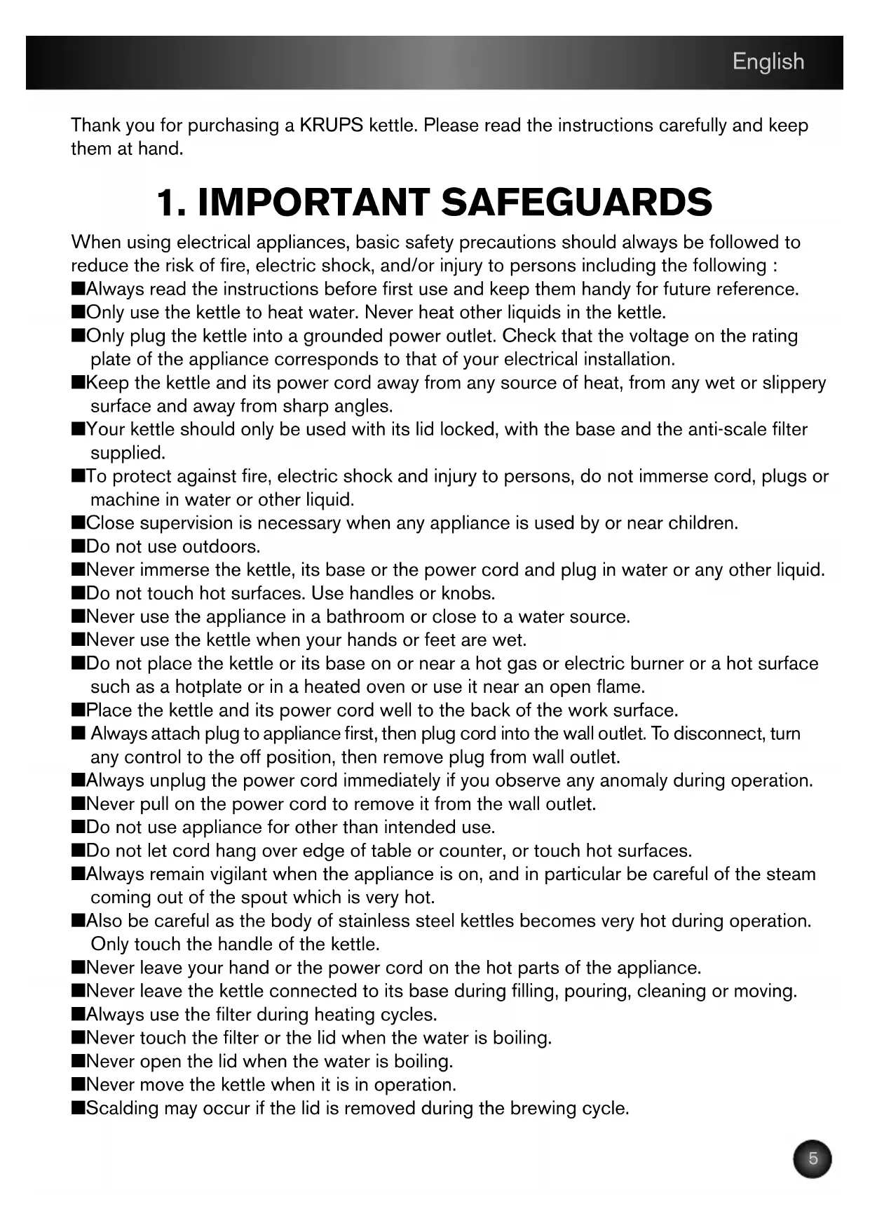 When using electrical appliances, basic safety precautions should always be followed to reduce the risk of fire, electric shock, and/or injury to persons including the following : n Always read the instructions before first use and keep them handy for future reference. n Only use the kettle to heat water. Never heat other liquids in the kettle. n Only plug the kettle into a grounded power outlet. Check that the voltage on the rating plate of the appliance corresponds to that of your electrical installation. n Keep the kettle and its power cord away from any source of heat, from any wet or slippery surface and away from sharp angles. n Your kettle should only be used with its lid locked, with the base and the anti-scale filter supplied. n To protect against fire, electric shock and injury to persons, do not immerse cord, plugs or machine in water or other liquid. n Close supervision is necessary when any appliance is used by or near children. n Do not use outdoors. n Never immerse the kettle, its base or the power cord and plug in water or any other liquid. n Do not touch hot surfaces. Use handles or knobs. n Never use the appliance in a bathroom or close to a water source. n Never use the kettle when your hands or feet are wet. n Do not place the kettle or its base on or near a hot gas or electric burner or a hot surface such as a hotplate or in a heated oven or use it near an open flame. n Place the kettle and its power cord well to the back of the work surface. n Always attach plug to appliance first, then plug cord into the wall outlet. To disconnect, turn any control to the off position, then remove plug from wall outlet. n Always unplug the power cord immediately if you observe any anomaly during operation. n Never pull on the power cord to remove it from the wall outlet. n Do not use appliance for other than intended use. n Do not let cord hang over edge of table or counter, or touch hot surfaces. n Always remain vigilant when the appliance is on, and in particular be careful of the steam coming out of the spout which is very hot. n Also be careful as the body of stainless steel kettles becomes very hot during operation. Only touch the handle of the kettle. n Never leave your hand or the power cord on the hot parts of the appliance. n Never leave the kettle connected to its base during filling, pouring, cleaning or moving. n Always use the filter during heating cycles. n Never touch the filter or the lid when the water is boiling. n Never open the lid when the water is boiling. n Never move the kettle when it is in operation. n Scalding may occur if the lid is removed during the brewing cycle. English