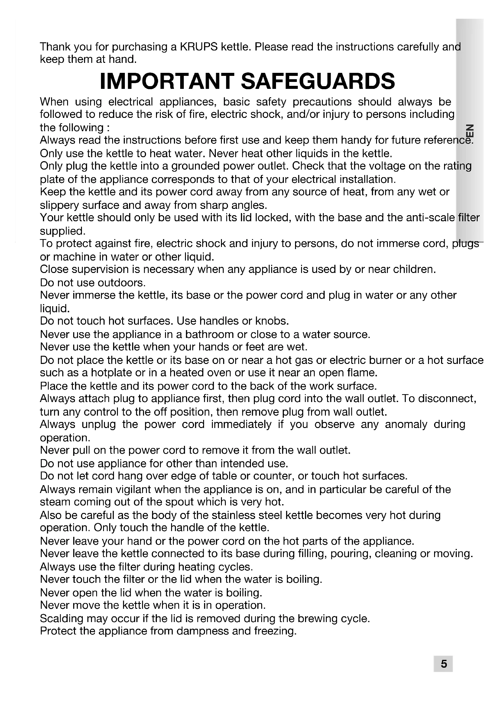 Thank you for purchasing a KRUPS kettle. Please read the instructions carefully and keep them at hand. IMPORTANT SAFEGUARDS When using electrical appliances, basic safety precautions should always be followed to reduce the risk of fire, electric shock, and/or injury to persons including the following : Always read the instructions before first use and keep them handy for future reference. Only use the kettle to heat water. Never heat other liquids in the kettle. Only plug the kettle into a grounded power outlet. Check that the voltage on the rating plate of the appliance corresponds to that of your electrical installation. Keep the kettle and its power cord away from any source of heat, from any wet or slippery surface and away from sharp angles. Your kettle should only be used with its lid locked, with the base and the anti-scale filter supplied. To protect against fire, electric shock and injury to persons, do not immerse cord, plugs or machine in water or other liquid. Close supervision is necessary when any appliance is used by or near children. Do not use outdoors. Never immerse the kettle, its base or the power cord and plug in water or any other liquid. Do not touch hot surfaces. Use handles or knobs. Never use the appliance in a bathroom or close to a water source. Never use the kettle when your hands or feet are wet. Do not place the kettle or its base on or near a hot gas or electric burner or a hot surface such as a hotplate or in a heated oven or use it near an open flame. Place the kettle and its power cord to the back of the work surface. Always attach plug to appliance first, then plug cord into the wall outlet. To disconnect, turn any control to the off position, then remove plug from wall outlet. Always unplug the power cord immediately if you observe any anomaly during operation. Never pull on the power cord to remove it from the wall outlet. Do not use appliance for other than intended use. Do not let cord hang over edge of table or counter, or touch hot surfaces. Always remain vigilant when the appliance is on, and in particular be careful of the steam coming out of the spout which is very hot. Also be careful as the body of the stainless steel kettle becomes very hot during operation. Only touch the handle of the kettle. Never leave your hand or the power cord on the hot parts of the appliance. Never leave the kettle connected to its base during filling, pouring, cleaning or moving. Always use the filter during heating cycles. Never touch the filter or the lid when the water is boiling. Never open the lid when the water is boiling. Never move the kettle when it is in operation. Scalding may occur if the lid is removed during the brewing cycle. Protect the appliance from dampness and freezing. KR_KETTLE_NC00113221-06_NAFTA_Mise en page 1 14/02/13 17:11 Page56 Never use the kettle if the power cord or the plug are damaged. To avoid any danger, always have them replaced by an authorized KRUPS After Sales Service Center. If your appliance has been damaged or if it is not working properly, do not use it and never attempt to disassemble it. We recommend that you have the appliance inspected. Any work required on the appliance, except for cleaning and descaling according to the instructions for use must be performed by a KRUPS After Sales Service Center. The warranty covers manufacturing defects and residential use only. Any breakage or damage resulting from a failure to comply with these instructions for use is not covered by the warranty. Any supply connection error will void the warranty. The warranty does not cover kettles that fail to operate or operate badly due to a failure to perform descaling operations. Unplug the appliance if you intend to not use it for an extended period of time or during cleaning operations. Allow to cool before putting on or taking off parts, and before cleaning the appliance. Never use scouring pads for cleaning purposes. To remove the anti-scale filter, remove the kettle from its base and allow it to cool down. Never remove the filter when the appliance is filled with hot water. Never use any descaling method other than the one recommended. All appliances are subject to strict quality control procedures. These include actual usage tests on randomly selected appliances, which would explain any traces of use. This appliance is not designed to be used by children or people without knowledge or experience with the product, unless they are supervised or given prior instruction concerning use of the appliance by a person responsible for their safety. Keep the appliance out of reach of children. Children should be supervised to ensure that they do not play with the appliance. Never heat the kettle when it is empty. Never fill the kettle past the maximum water level mark, nor below the minimum water level mark. If the kettle is too full, some water may spray out. Your appliance is designed for residential use only. The use of accessory attachments not recommended by the appliance manufacturer may result in fire, electric shock or injury to persons.