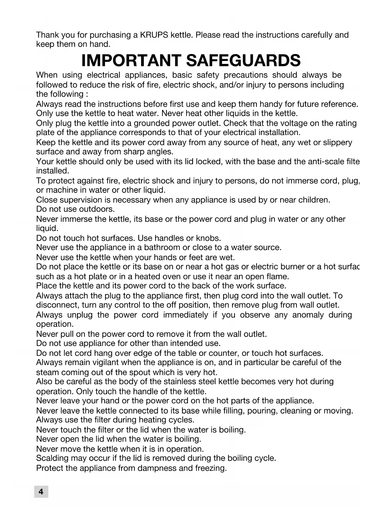 OFF KR_BOUILLOIRE_PERFORMA_NAFTA_NC00123439_Mise en page 1 18/04/14 10:14 Page2Thank you for purchasing a KRUPS kettle. Please read the instructions carefully and keep them on hand. IMPORTANT SAFEGUARDS When using electrical appliances, basic safety precautions should always be followed to reduce the risk of fire, electric shock, and/or injury to persons including the following : Always read the instructions before first use and keep them handy for future reference. Only use the kettle to heat water. Never heat other liquids in the kettle. Only plug the kettle into a grounded power outlet. Check that the voltage on the rating plate of the appliance corresponds to that of your electrical installation. Keep the kettle and its power cord away from any source of heat, any wet or slippery surface and away from sharp angles. Your kettle should only be used with its lid locked, with the base and the anti-scale filter installed. To protect against fire, electric shock and injury to persons, do not immerse cord, plug, or machine in water or other liquid. Close supervision is necessary when any appliance is used by or near children. Do not use outdoors. Never immerse the kettle, its base or the power cord and plug in water or any other liquid. Do not touch hot surfaces. Use handles or knobs. Never use the appliance in a bathroom or close to a water source. Never use the kettle when your hands or feet are wet. Do not place the kettle or its base on or near a hot gas or electric burner or a hot surface such as a hot plate or in a heated oven or use it near an open flame. Place the kettle and its power cord to the back of the work surface. Always attach the plug to the appliance first, then plug cord into the wall outlet. To disconnect, turn any control to the off position, then remove plug from wall outlet. Always unplug the power cord immediately if you observe any anomaly during operation. Never pull on the power cord to remove it from the wall outlet. Do not use appliance for other than intended use. Do not let cord hang over edge of the table or counter, or touch hot surfaces. Always remain vigilant when the appliance is on, and in particular be careful of the steam coming out of the spout which is very hot. Also be careful as the body of the stainless steel kettle becomes very hot during operation. Only touch the handle of the kettle. Never leave your hand or the power cord on the hot parts of the appliance. Never leave the kettle connected to its base while filling, pouring, cleaning or moving. Always use the filter during heating cycles. Never touch the filter or the lid when the water is boiling. Never open the lid when the water is boiling. Never move the kettle when it is in operation. Scalding may occur if the lid is removed during the boiling cycle. Protect the appliance from dampness and freezing.