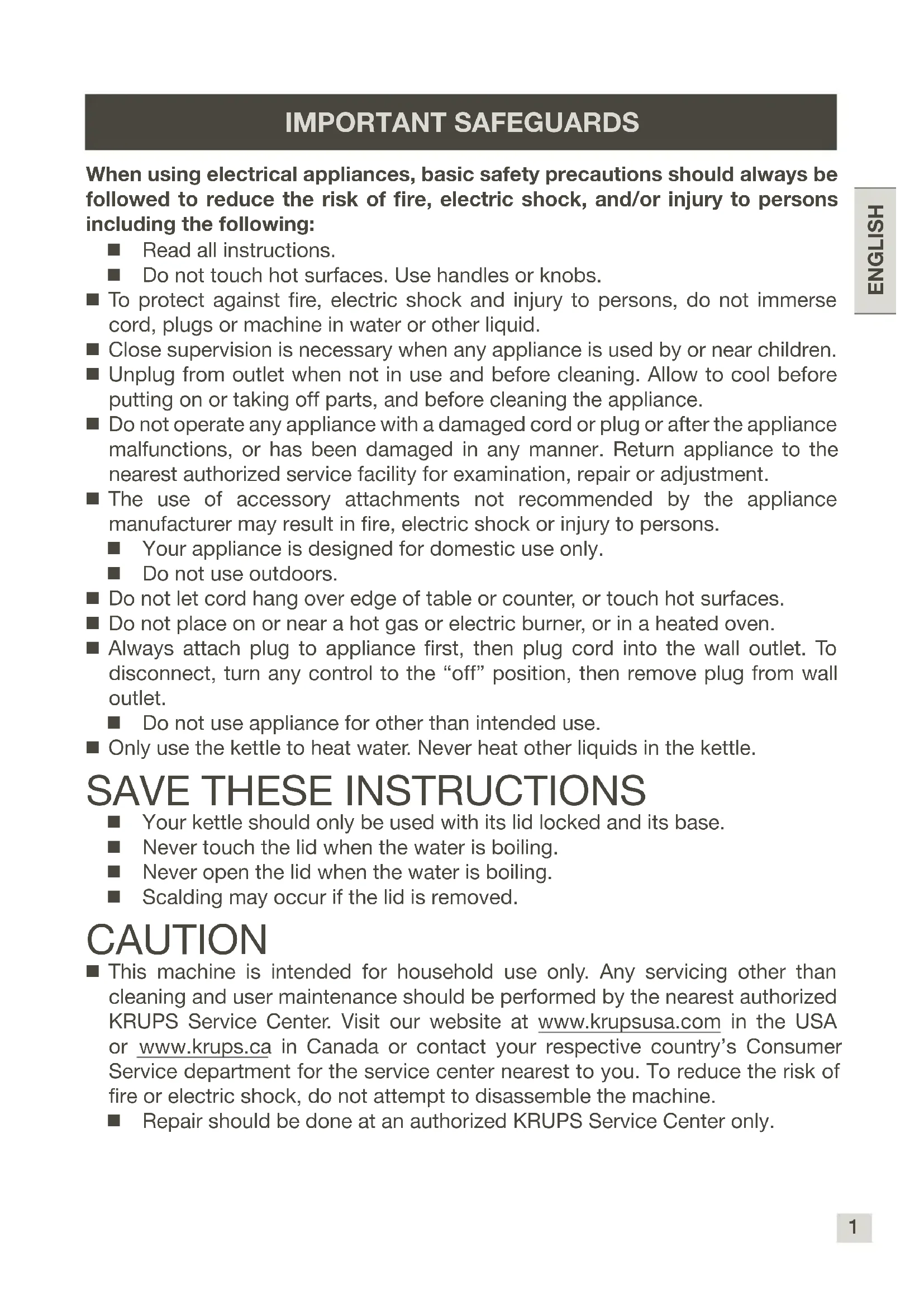 Your kettle should only be used with its lid locked and its base. Never touch the lid when the water is boiling. Never open the lid when the water is boiling. Scalding may occur if the lid is removed. CAUTION This machine is intended for household use only. Any servicing other than cleaning and user maintenance should be performed by the nearest authorized KRUPS Service Center. Visit our website at www.krupsusa.com in the USA or www.krups.ca in Canada or contact your respective country’s Consumer Service department for the service center nearest to you. To reduce the risk of re or electric shock, do not attempt to disassemble the machine. Repair should be done at an authorized KRUPS Service Center only. IMPORTANT SAFEGUARDS2