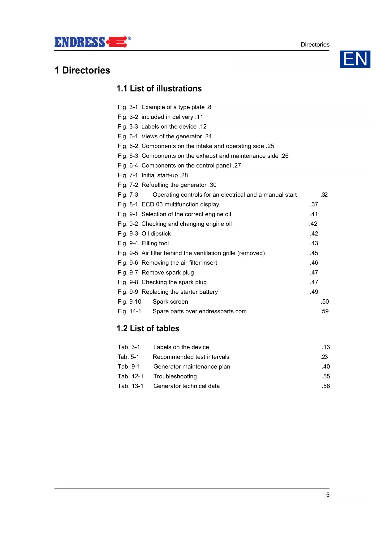 Fig. 3-1 Example of a type plate .8 Fig. 3-2 included in delivery .11 Fig. 3-3 Labels on the device .12 Fig. 6-1 Views of the generator .24 Fig. 6-2 Components on the intake and operating side .25 Fig. 6-3 Components on the exhaust and maintenance side .26 Fig. 6-4 Components on the control panel .27 Fig. 7-1 Initial start-up .28 Fig. 7-2 Refuelling the generator .30 Fig. 7-3 Operating controls for an electrical and a manual start.32 Fig. 8-1 ECD 03 multifunction display .37 Fig. 9-1 Selection of the correct engine oil .41 Fig. 9-2 Checking and changing engine oil .42 Fig. 9-3 Oil dipstick .42 Fig. 9-4 Filling tool .43 Fig. 9-5 Air filter behind the ventilation grille (removed) .45 Fig. 9-6 Removing the air filter insert .46 Fig. 9-7 Remove spark plug .47 Fig. 9-8 Checking the spark plug .47 Fig. 9-9 Replacing the starter battery .49 Fig. 9-10 Spark screen .50 Fig. 14-1 Spare parts over endressparts.com .59 Tab. 3-1 Labels on the device .13 Tab. 5-1 Recommended test intervals .23 Tab. 9-1 Generator maintenance plan .40 Tab. 12-1 Troubleshooting .55 Tab. 13-1 Generator technical data .58 EN6 About this manual 2 About this manual Through publication of this operating manual we wish to describe and ex- plain your power generator and its use in the best possible way. In doing so we have oriented ourselves on the latest European standard DIN EN 82079-1 when creating this operating manuals. NOTICE! It is absolutely essential for safe and appropriate use that you read through this manual very carefully and understand it before using the device for the first time. Your observance of it creates the foundation for,