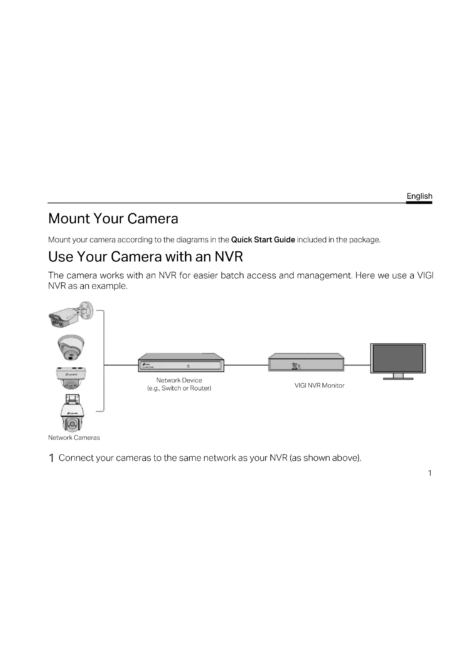 49 / Tiếng Việt 53 /1 English Mount Your Camera Mount your camera according to the diagrams in the Quick Start Guide included in the package. Use Your Camera with an NVR The camera works with an NVR for easier batch access and management. Here we use a VIGI NVR as an example. Network Device (e.g., Switch or Router) VIGI NVR Monitor Network Cameras