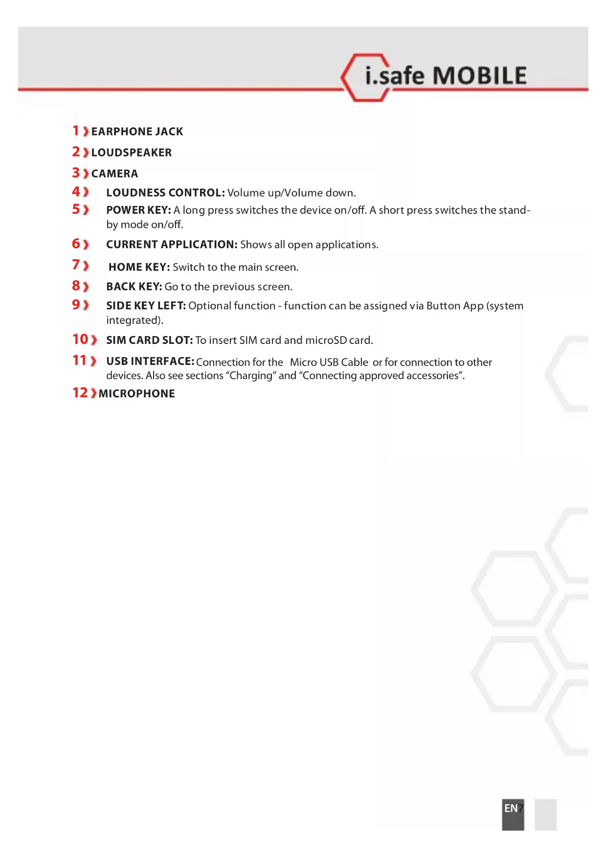When turning on the device for the rst time, follow the instructions on the screen. Further information on operating the device can be found at www.isafe-mobile.com/en/support/service under the menu item “FAQ”. Detailed information on operating the Android operating system can be found at: https://support.google.com/android NOTICE The microphone is located on the bottom of the device. For an optimal communication, make sure that the microphone is not covered.