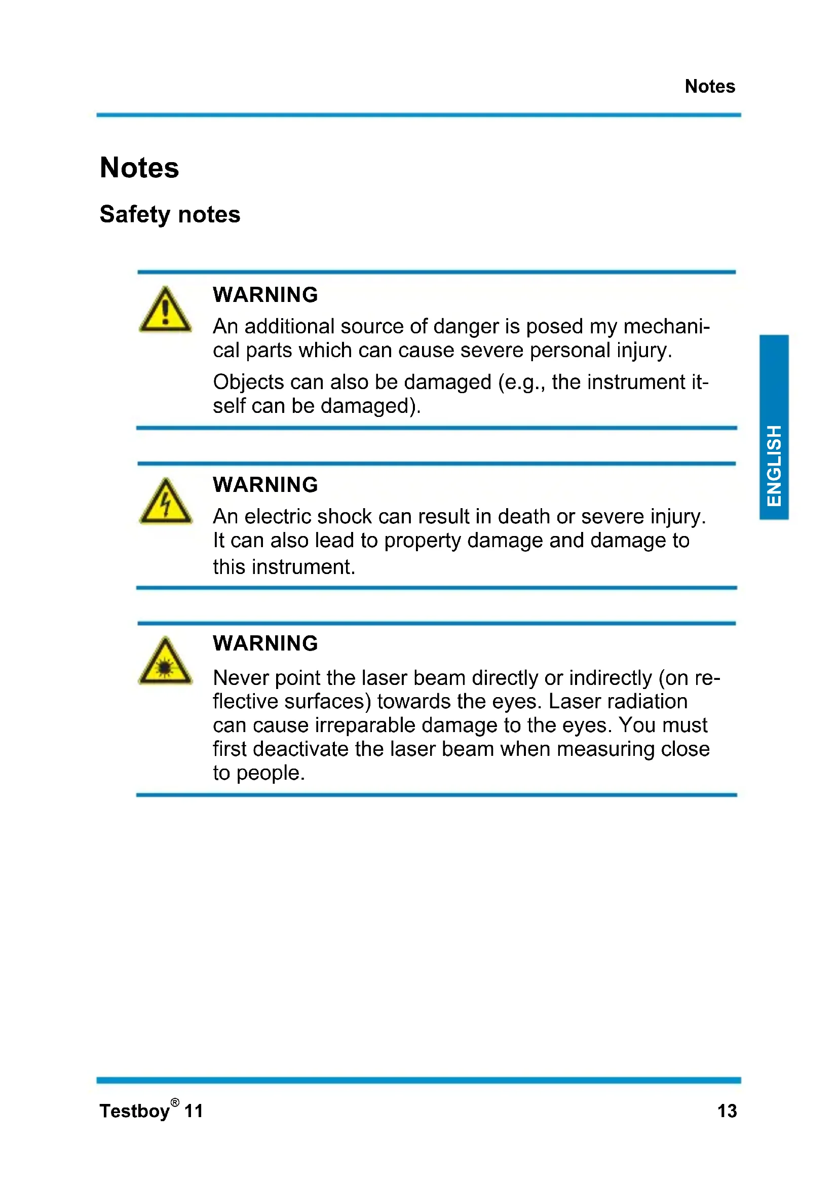 WARNING Never point the laser beam directly or indirectly (on re- flective surfaces) towards the eyes. Laser radiation can cause irreparable damage to the eyes. You must first deactivate the laser beam when measuring close to people.Notes 14 Testboy