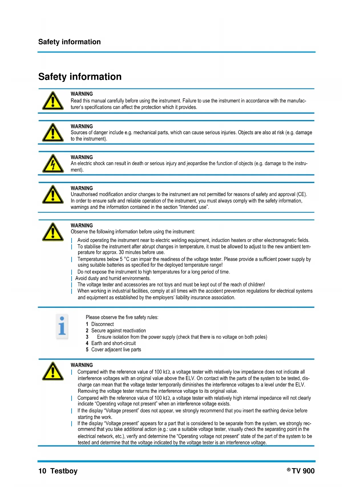 WARNING | Compared with the reference value of 100 k, a voltage tester with relatively low impedance does not indicate all interference voltages with an original value above the ELV. On contact with the parts of the system to be tested, dis- charge can mean that the voltage tester temporarily diminishes the interference voltages to a level under the ELV. Removing the voltage tester returns the interference voltage to its original value. | Compared with the reference value of 100 k, a voltage tester with relatively high internal impedance will not clearly indicate “Operating voltage not present” when an interference voltage exists. | If the display “Voltage present” does not appear, we strongly recommend that you insert the earthing device before starting the work. | If the display “Voltage present” appears for a part that is considered to be separate from the system, we strongly rec- ommend that you take additional action (e.g.: use a suitable voltage tester, visually check the separating point in the electrical network, etc.), verify and determine the “Operating voltage not present” state of the part of the system to be tested and determine that the voltage indicated by the voltage tester is an interference voltage.Safety information Testboy