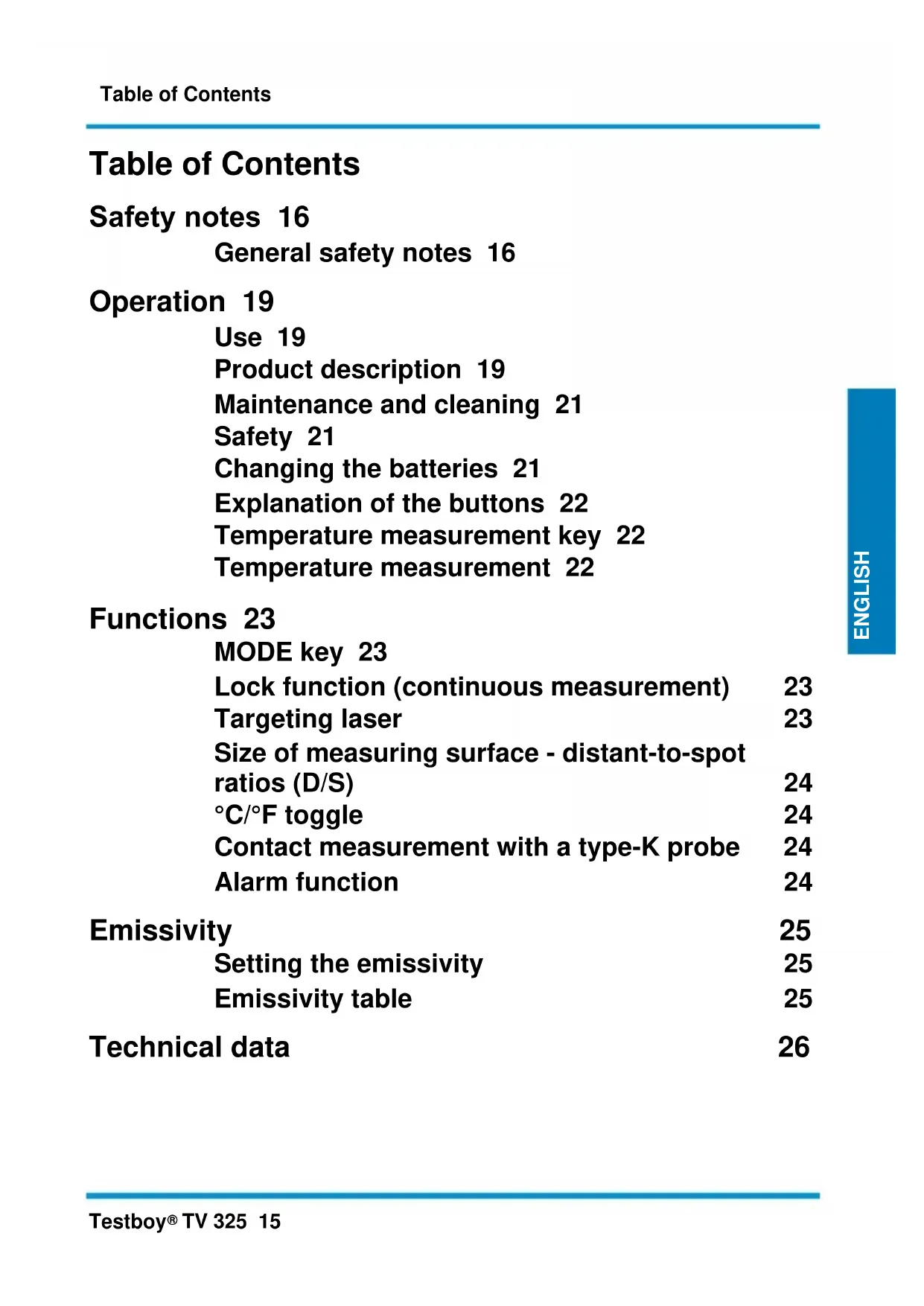 TV 325 15 DEUTSCH DEUTSCH ENGLISH Table of Contents Safety notes 16 General safety notes 16 Operation 19 Use 19 Product description 19 Maintenance and cleaning 21 Safety 21 Changing the batteries 21 Explanation of the buttons 22 Temperature measurement key 22 Temperature measurement 22 Functions 23 MODE key 23 Lock function (continuous measurement) 23 Targeting laser 23 Size of measuring surface - distant-to-spot ratios (D/S) 24 °C/°F toggle 24 Contact measurement with a type-K probe 24 Alarm function 24 Emissivity 25 Setting the emissivity 25 Emissivity table 25 Technical data 26Safety notes 16 Testboy