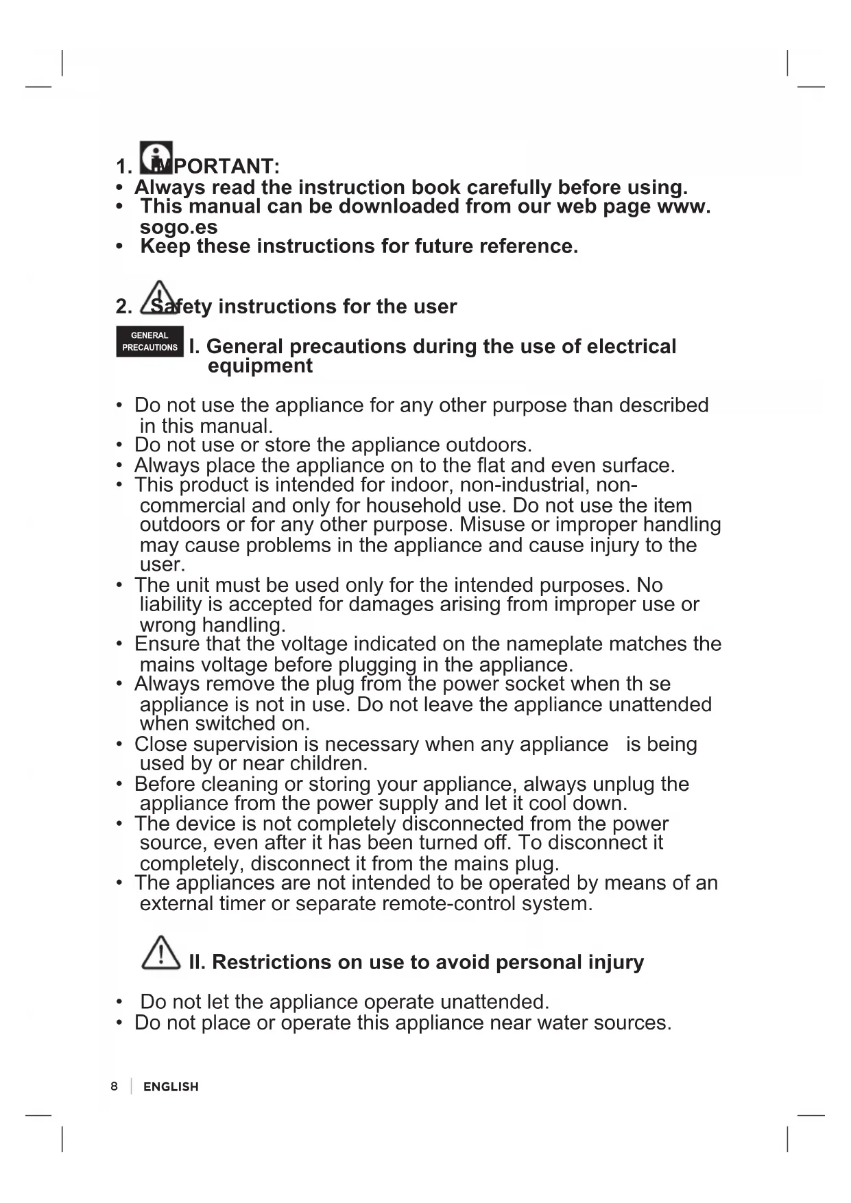 - This product is intended for indoor, non-industrial, non- commercial and only for household use. Do not use the item outdoors or for any other purpose. Misuse or improper handling may cause problems in the appliance and cause injury to the user.