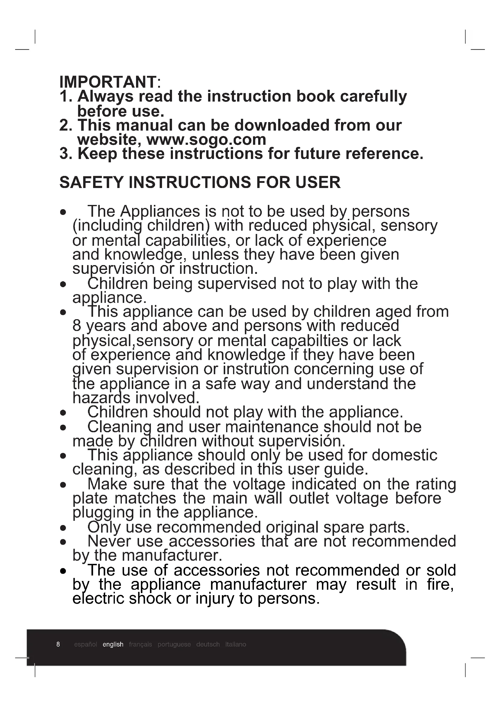 - The use of accessories not recommended or sold by the appliance manufacturer may result in re, electric shock or injury to persons.9 español english français portuguese deutsch italiano