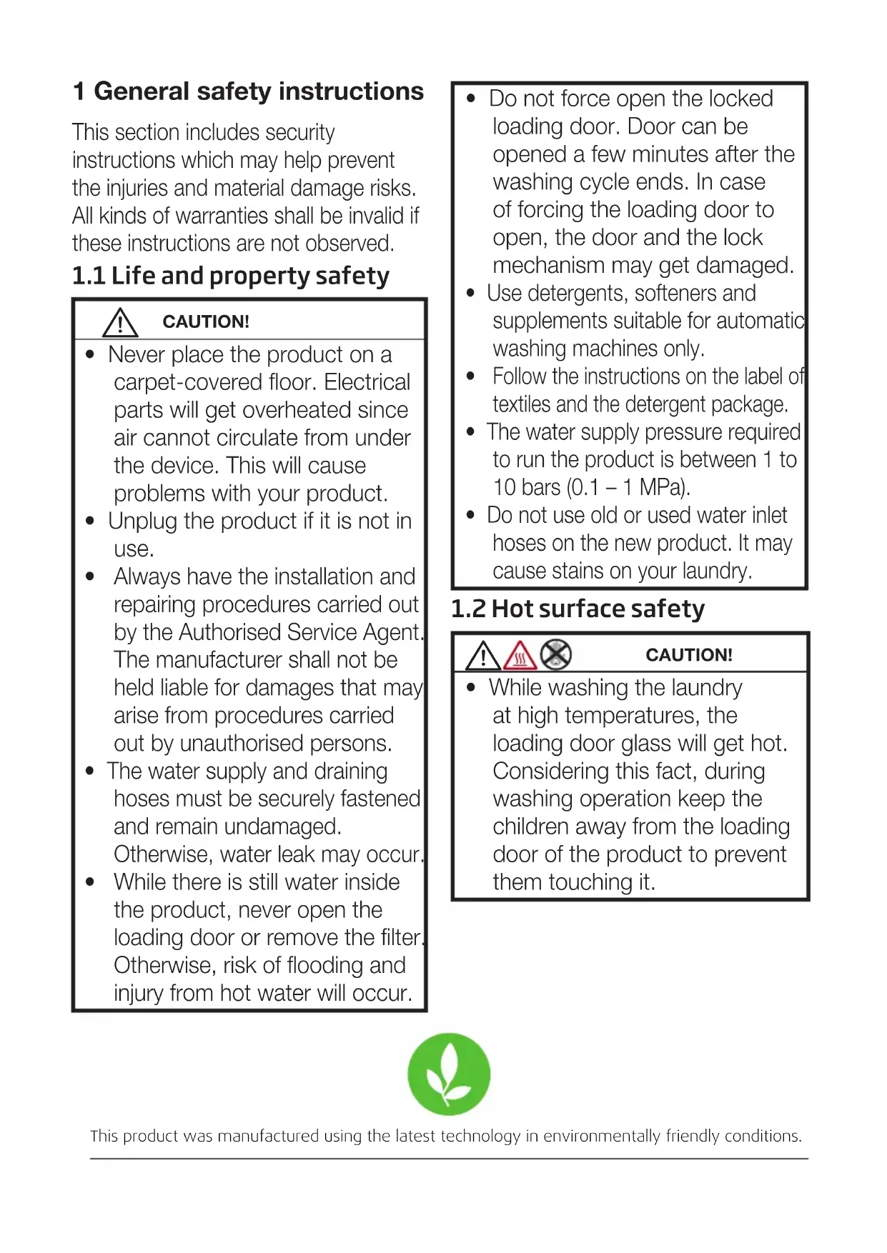 While there is still water inside the product, never open the loading door or remove the filter. Otherwise, risk of flooding and injury from hot water will occur. This product was manufactured using the latest technology in environmentally friendly conditions.3 / EN Washing Machine / User Manual