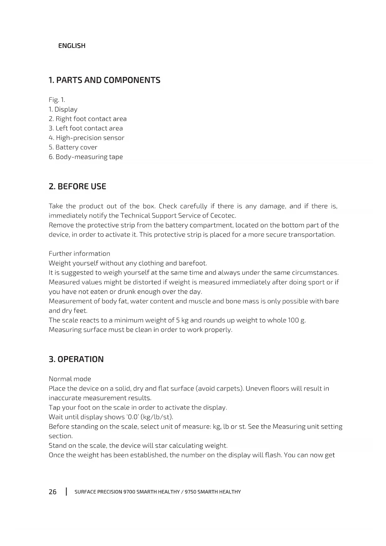 Take the product out of the box. Check carefully if there is any damage, and if there is, immediately notify the Technical Support Service of Cecotec. Remove the protective strip from the battery compartment, located on the bottom part of the device, in order to activate it. This protective strip is placed for a more secure transportation. Further information Weight yourself without any clothing and barefoot. It is suggested to weigh yourself at the same time and always under the same circumstances. Measured values might be distorted if weight is measured immediately after doing sport or if you have not eaten or drunk enough over the day. Measurement of body fat, water content and muscle and bone mass is only possible with bare and dry feet. The scale reacts to a minimum weight of 5 kg and rounds up weight to whole 100 g. Measuring surface must be clean in order to work properly.