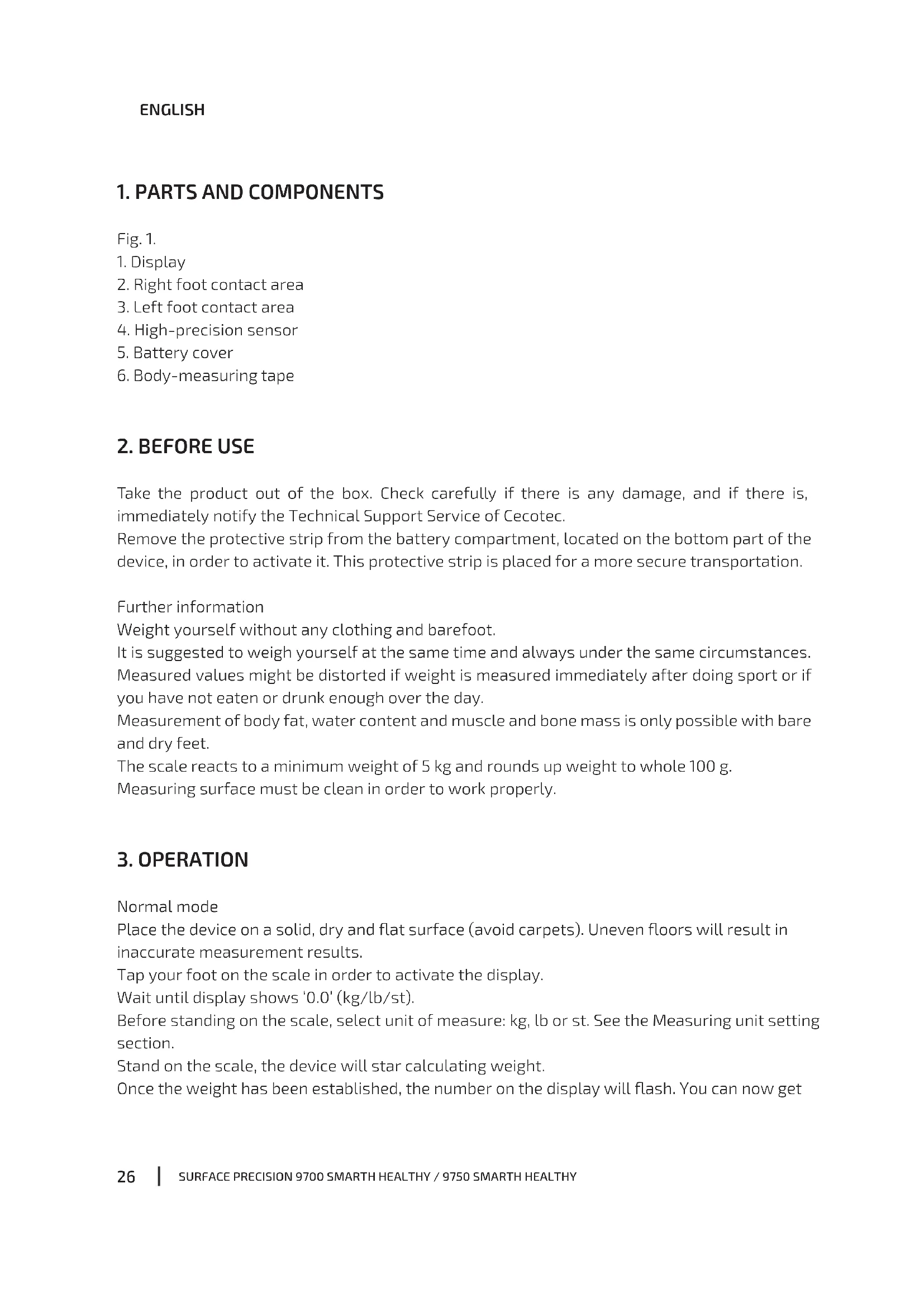 Take the product out of the box. Check carefully if there is any damage, and if there is, immediately notify the Technical Support Service of Cecotec. Remove the protective strip from the battery compartment, located on the bottom part of the device, in order to activate it. This protective strip is placed for a more secure transportation. Further information Weight yourself without any clothing and barefoot. It is suggested to weigh yourself at the same time and always under the same circumstances. Measured values might be distorted if weight is measured immediately after doing sport or if you have not eaten or drunk enough over the day. Measurement of body fat, water content and muscle and bone mass is only possible with bare and dry feet. The scale reacts to a minimum weight of 5 kg and rounds up weight to whole 100 g. Measuring surface must be clean in order to work properly.