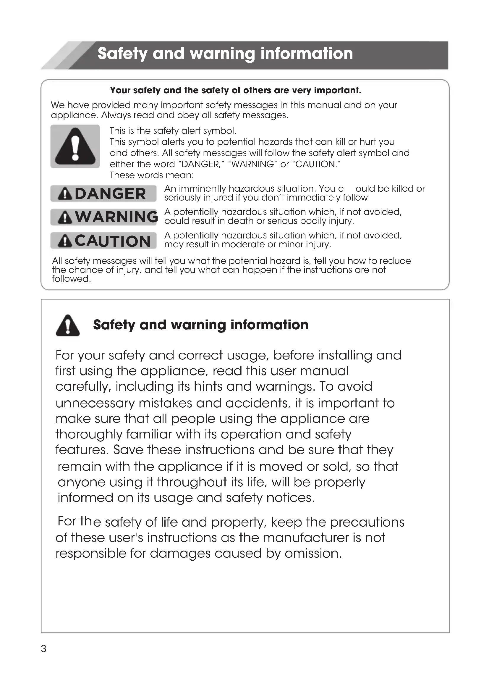 UTION Safety and warning information Safety and warning information For your safety and correct usage, before installing and first using the appliance, read this user manual carefully, including its hints and warnings. To avoid unnecessary mistakes and accidents, it is important to make sure that all people using the appliance are thoroughly familiar with its operation and safety features. Save these instructions and be sure that they remain with the appliance if it is moved or sold, so that anyone using it throughout its life, will be properly informed on its usage and safety notices. For th e safety of life and property, keep the precautions of these user's instructions as the manufacturer is not responsible for damages caused by omission. We have provided many important safety messages in this manual and on your appliance. Always read and obey all safety messages.These words mean:This is the safety alert symbol.This symbol alerts you to potential hazards that can kill or hurt you and others. All safety messages will follow the safety alert symbol and either the word “DANGER,” “WARNING” or “CAUTION.”An imminently hazardous situation. You could be killed or seriously injured if you don’t immediately follow A potentially hazardous situation which, if not avoided, could result in death or serious bodily injury.A potentially hazardous situation which, if not avoided, may result in moderate or minor injury. All safety messages will tell you what the potential hazard is, tell you how to reduce the chance of injury, and tell you what can happen if the instructions are not followed.Safety for children and others who are vulnerable people According to EN standard This appliance can be used by children aged from 8 years and above and persons with reduced physical, sensory or mental capabilities or lack of experience and knowledge if they have been given supervision or instruction concerning use of the appliance in a safe way and understand the hazards involved. Children shall not play with the appliance. Cleaning and user maintenance shall not be made by children without supervision. Children aged from 3 to 8 years are allowed to load and unload refrigerating appliances. According to IEC standard This appliance is not intended for use by persons (including children) with reduced physical sensory or mental capabilities, or lack of experience and knowledge, unless they have been given supervision or instruction concerning use of the appliance by a person responsible for their safety. Children should be supervised to ensure that they do not play with the appliance. Keep all packaging away from children as there is risk of suffocation. If you are discarding the appliance, pull the plug out of the socket, cut the connection cable (as close to the appliance as you can) and remove the door to prevent children playing from suffering an electric shock or from closing themselves inside it. If this appliance, featuring a magnetic door seals, is to replace an older appliance having a spring lock (latch) on the door or lid, be sure to make the spring lock unusable before you discard the old appliance. This will prevent it from becoming a death trap for a child. 4General safety WARNING —This appliance is intended to be used in household and similar applications such as -staff kitchen areas in shops, offices and other working environments; -farm houses and by clients in hotels, motels and other residential type environments; -bed and breakfast type environments; -catering and similar non-retail applications. WARNING — Do not store explosive substances such as aerosol cans with a flammable propellant in this appliance. WARNING — If the supply cord is damaged, it must be replaced by the manufacturer, its service agent or similarly qualified persons in order to avoid a hazard. WARNING — Keep ventilation openings, in the appliance enclosure or in the built-in structure, clear of obstruction. WARNING — Do not use mechanical devices or other means to accelerate the defrosting process, other than those recommended by the manufacturer. WARNING — Do not damage the refrigerant circuit. WARNING — Do not use electrical appliances inside the food storage compartments of the appliance, unless they are of the type recommended by the manufacturer. WARNING — The refrigerant and insulation blowing gas are flammable. When disposing of the appliance, do so only at an authorized waste disposal centre. Do not expose to flame. WARNING —When positioning the appliance, ensure the supply cord is not trapped or damaged. 5WARNING —Do not locate multiple portable socket- outlets or portable power supplies at the rear of the appliance. WARNING —Food needs to be packed in bags before putting into the refrigerator, and liquids need to be packed in bottles or containers to avoid the problem that the product design structure is not easy to clean. The symbol is a warning and indicates the refrigerant and insulation blowing gas are flammable.