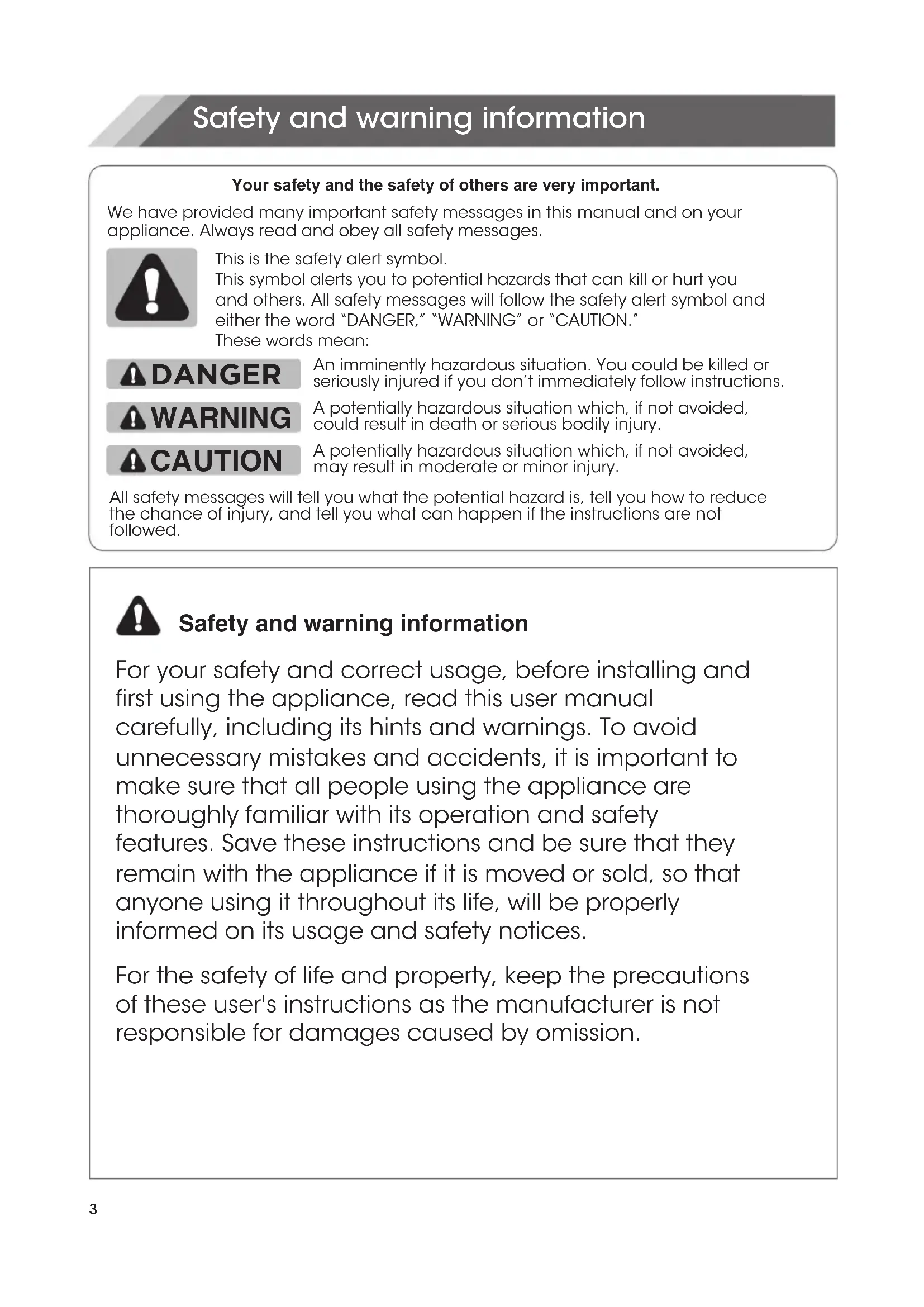 UTION Safety and warning information Safety and warning information For your safety and correct usage, before installing and first using the appliance, read this user manual carefully, including its hints and warnings. To avoid unnecessary mistakes and accidents, it is important to make sure that all people using the appliance are thoroughly familiar with its operation and safety features. Save these instructions and be sure that they remain with the appliance if it is moved or sold, so that anyone using it throughout its life, will be properly informed on its usage and safety notices. For the safety of life and property, keep the precautions of these user's instructions as the manufacturer is not responsible for damages caused by omission. We have provided many important safety messages in this manual and on your appliance. Always read and obey all safety messages. These words mean: This is the safety alert symbol. This symbol alerts you to potential hazards that can kill or hurt you and others. All safety messages will follow the safety alert symbol and either the word “DANGER,” “WARNING” or “CAUTION.” An imminently hazardous situation. You could be killed or seriously injured if you don’t immediately follow instructions. A potentially hazardous situation which, if not avoided, could result in death or serious bodily injury. A potentially hazardous situation which, if not avoided, may result in moderate or minor injury.