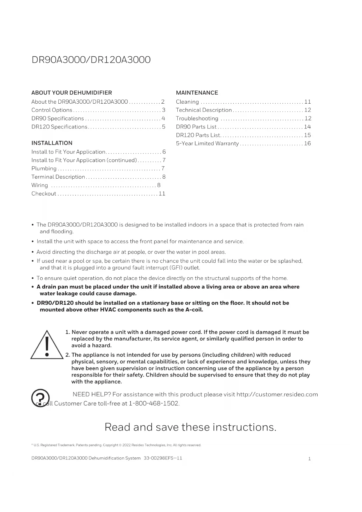 COMIENZAN EN LA PÁGINA 6DR90A3000/DR120A3000 NEED HELP? For assistance with this product please visit http://customer.resideo.com or call Customer Care toll-free at 18004681502. Read and save these instructions. ® U.S. Registered Trademark. Patents pending. Copyright © 2022 Resideo Technologies, Inc. All rights reserved.