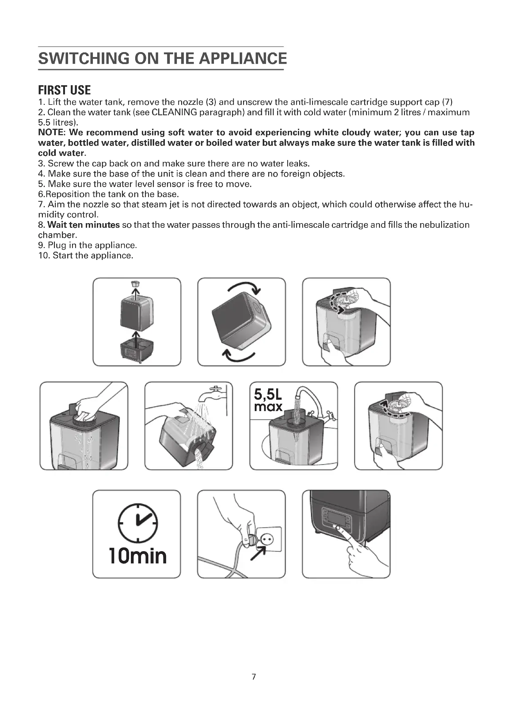 FIRST USE 1. Lift the water tank, remove the nozzle (3) and unscrew the anti-limescale cartridge support cap (7)2. Clean the water tank (see CLEANING paragraph) and fill it with cold water (minimum 2 litres / maximum5.5 litres).NOTE: We recommend using soft water to avoid experiencing white cloudy water; you can use tapwater, bottled water, distilled water or boiled water but always make sure the water tank is filled withcold water.3. Screw the cap back on and make sure there are no water leaks.4. Make sure the base of the unit is clean and there are no foreign objects.5. Make sure the water level sensor is free to move.6.Reposition the tank on the base.7. Aim the nozzle so that steam jet is not directed towards an object, which could otherwise affect the hu-midity control.