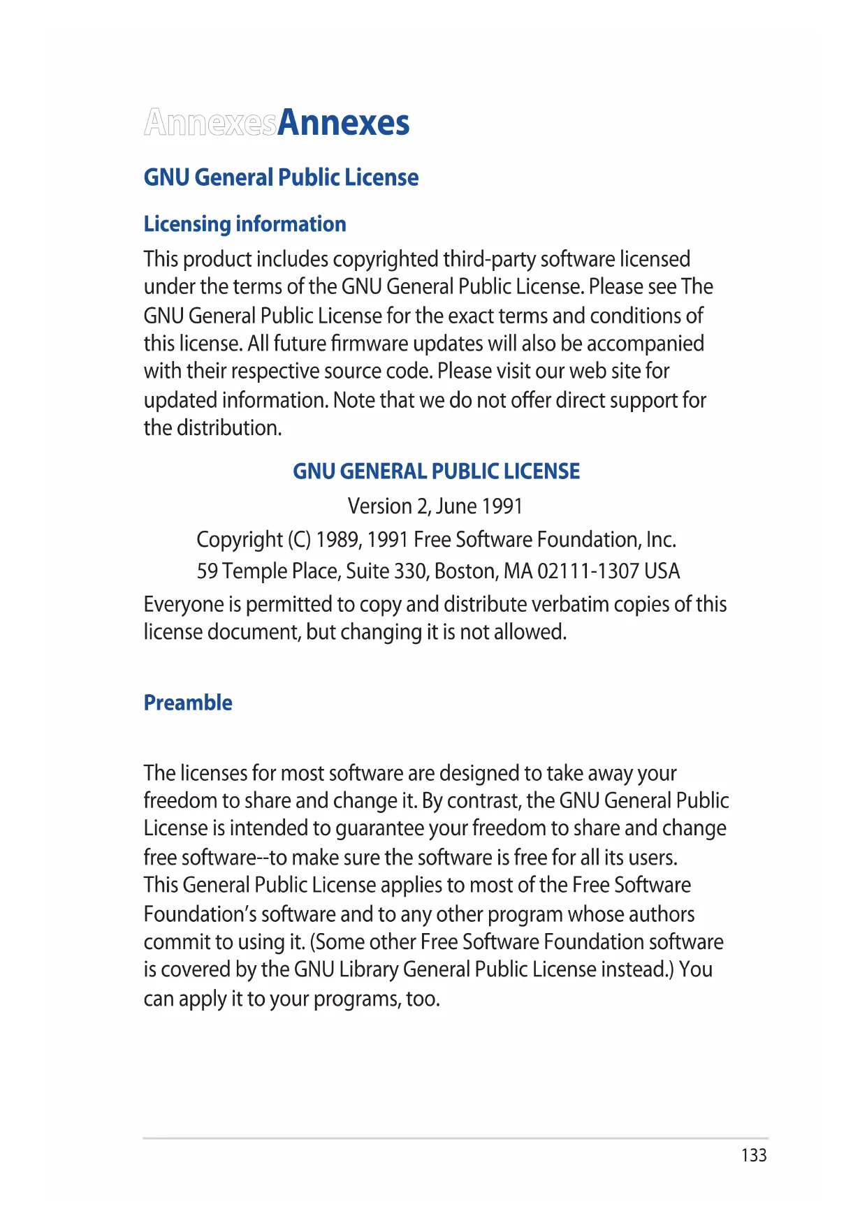 Version 2, June 1991 Copyright (C) 1989, 1991 Free Software Foundation, Inc. 59 Temple Place, Suite 330, Boston, MA 02111-1307 USA Everyone is permitted to copy and distribute verbatim copies of this license document, but changing it is not allowed. Preamble The licenses for most software are designed to take away your freedom to share and change it. By contrast, the GNU General Public License is intended to guarantee your freedom to share and change free software--to make sure the software is free for all its users. This General Public License applies to most of the Free Software Foundation’s software and to any other program whose authors commit to using it. (Some other Free Software Foundation software is covered by the GNU Library General Public License instead.) You can apply it to your programs, too. AnnexesAnnexes134 When we speak of free software, we are referring to freedom, not price. Our General Public Licenses are designed to make sure that you have the freedom to distribute copies of free software (and charge for this service if you wish), that you receive source code or can get it if you want it, that you can change the software or use pieces of it in new free programs; and that you know you can do these things. To protect your rights, we need to make restrictions that forbid anyone to deny you these rights or to ask you to surrender the rights. These restrictions translate to certain responsibilities for you if you distribute copies of the software, or if you modify it. For example, if you distribute copies of such a program, whether gratis or for a fee, you must give the recipients all the rights that you have. You must make sure that they, too, receive or can get the source code. And you must show them these terms so they know their rights. We protect your rights with two steps: (1) copyright the software, and (2) offer you this license which gives you legal permission to copy, distribute and/or modify the software. Also, for each author’s protection and ours, we want to make certain that everyone understands that there is no warranty for this free software. If the software is modified by someone else and passed on, we want its recipients to know that what they have is not the original, so that any problems introduced by others will not reflect on the original authors’ reputations.135 Finally, any free program is threatened constantly by software patents. We wish to avoid the danger that redistributors of a free program will individually obtain patent licenses, in effect making the program proprietary. To prevent this, we have made it clear that any patent must be licensed for everyone’s free use or not licensed at all. The precise terms and conditions for copying, distribution and modification follow. Terms & conditions for copying, distribution, & modification