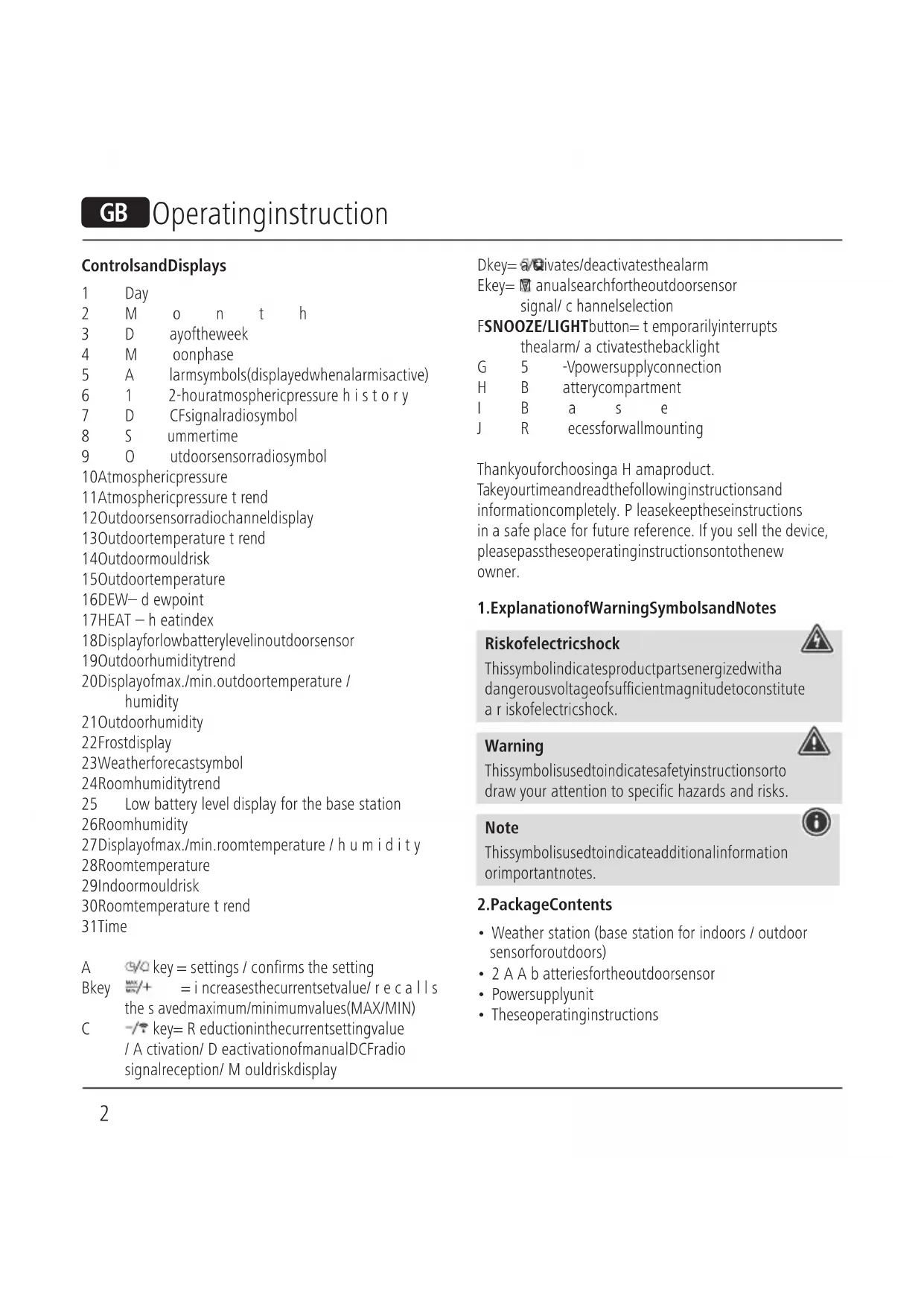 G Operating instruction Controls and Displays 1Day 2Month 3Day of the week 4Moon phase 5Alarm symbols (displayed when alarm is active) 612-hour atmospheric pressurehistory 7DCF signal radio symbol 8Summer time 9Outdoor sensor radio symbol 10 Atmospheric pressure 11 Atmospheric pressuretrend 12 Outdoor sensor radio channel display 13 Outdoor temperaturetrend 14 Outdoor mould risk 15 Outdoor temperature 16 DEW –dew point 17 HEAT–heat index 18 Display for low battery level in outdoor sensor 19 Outdoor humidity trend 20 Display of max./min. outdoor temperature/ humidity 21 Outdoor humidity 22 Frost display 23 Weather forecast symbol 24 Room humidity trend 25 Lowbattery level display for the base station 26 Room humidity 27 Display of max./min. room temperature/humidity 28 Room temperature 29 Indoor mould risk 30 Room temperaturetrend 31 Time