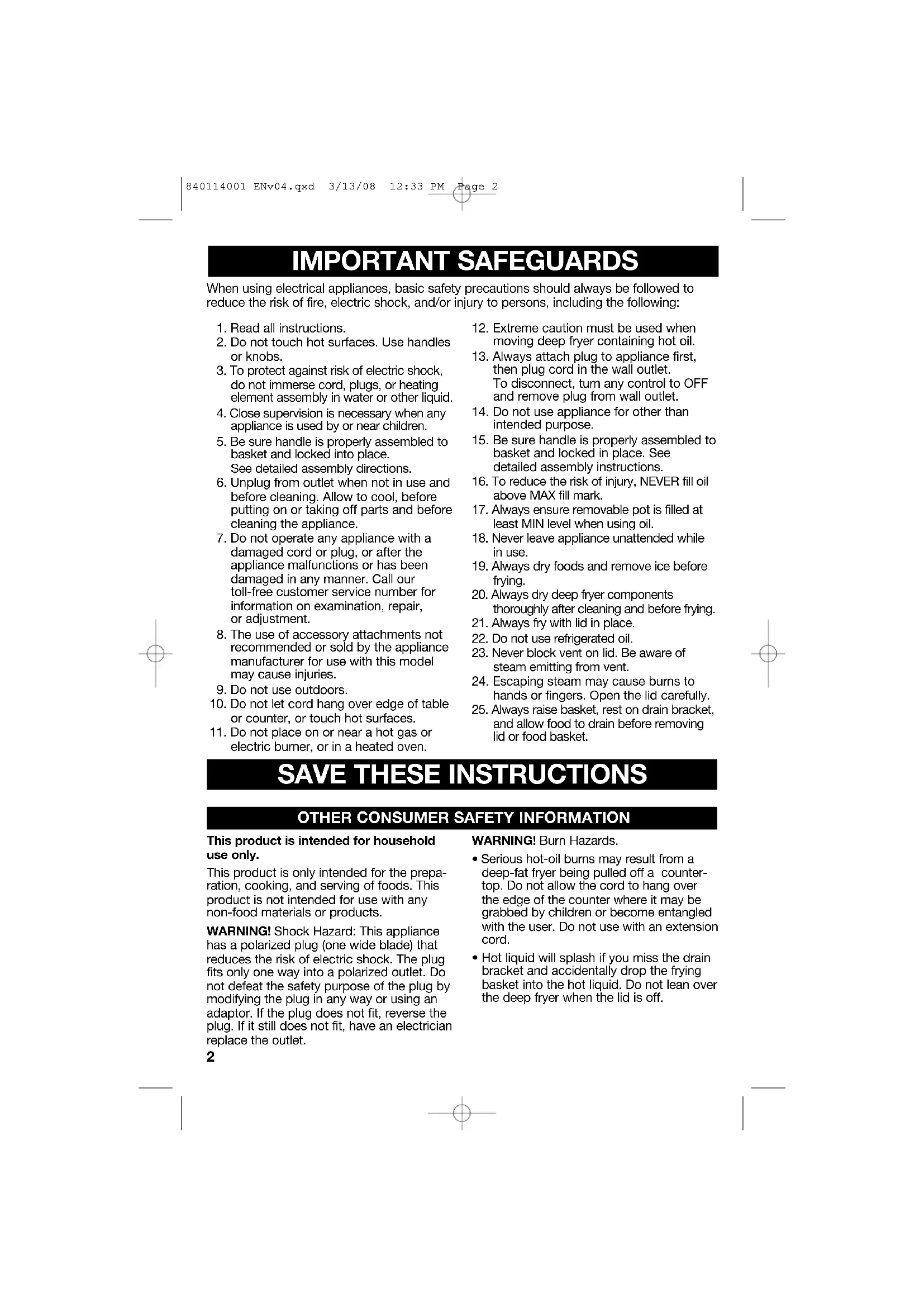 When using electrical appliances, basic safety precautions should always be followed to reduce the risk of fire, electric shock, and/or injury to persons, including the following: 840114001 ENv04.qxd 3/13/08 12:33 PM Page 23 Parts and Features Removable Filter Cover Charcoal Odor Filter Washable Grease Filter View Window Frying Basket Removable Oil Pot Lid Release (OPEN) Button Power Light Plastic Housing Ready to Cook Light Rotary Timer with Signal Bell Adjustable Thermostat Handle Handle Lock Release Magnetic Cord Assembly Removable Lid 840114001 ENv04.qxd 3/13/08 12:33 PM Page 34
