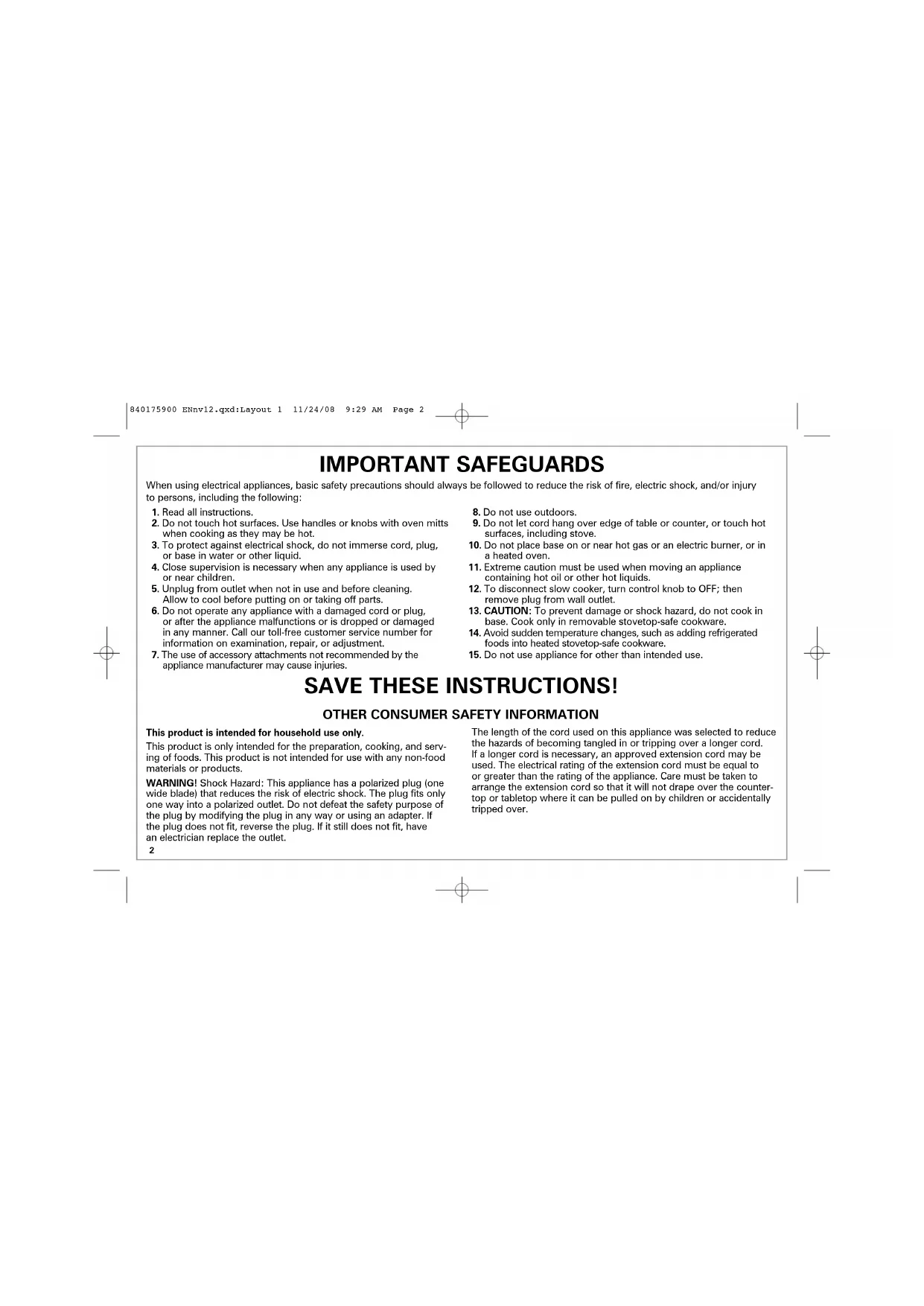 When using electrical appliances, basic safety precautions should always be followed to reduce the risk of fire, electric shock, and/or injury to persons, including the following: SAVE THESE INSTRUCTIONS! 840175900 ENnv12.qxd:Layout 1 11/24/08 9:29 AM Page 23 GLASS LID AND STOVETOP-SAFE COOKWARE: PRECAUTIONS AND INFORMATION