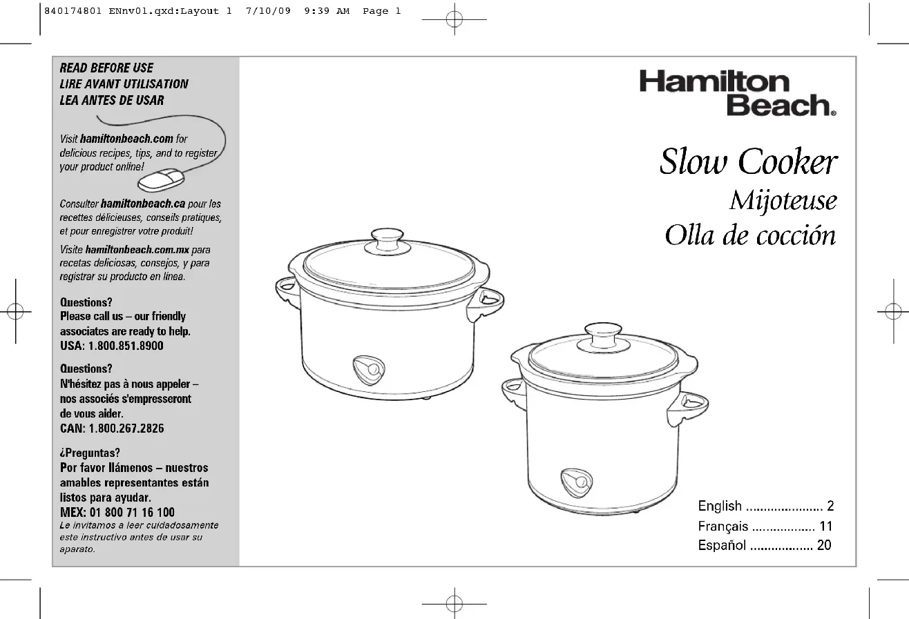 - If cooking a vegetable-type casserole, there will need to be liquid in the recipe to prevent scorching on the sides of crock. 840174801 ENnv01.qxd:Layout 1 7/10/09 9:39 AM Page 78 Cooking Chart RECIPE 3-5 QT/L 6-7 QT/L 8 QT/L INSTRUCTIONS Beef Pot 2 lb. (907 g) beef pot roast 3-5 lb. (1.3-2.2 kg) beef pot roast 4-6 lb. (1.8-2.7 kg) beef pot roast Roast 1 teaspoon (5 ml) salt 1-1/2 teaspoons (7.5 ml) salt 2 teaspoons (10 ml) salt 1/2 teaspoon (2.5 ml) pepper 1 teaspoon (5 ml) pepper 1 teaspoon (5 ml) pepper 1/4 (60 ml) cup beef broth/water 1/2 cup (125 ml) beef broth/water 3/4 cup (175 ml) beef broth/water 1/2 to 1 envelope dry onion mix 1 envelope dry onion mix 1 envelope dry onion mix 1 onion, quartered 2 onions, quartered 3 onions, quartered 2 potatoes, quartered 3-4 potatoes, quartered 5-6 potatoes, quartered 2 carrots, cut in 1” 3-4 carrots, cut in 1” 5-6 carrots, cut in 1” (2.5 cm) pieces (2.5 cm) pieces (2.5 cm) pieces Chili 1 lb. (450 g) ground beef 2 lb. (907 g) ground beef 4 lb. (1.8 kg) ground beef 1 1.5 oz (40 g) envelope 2 1.5 oz (40 g) envelopes 4 1.5 oz (40 g) envelopes chili seasoning chili seasoning chili seasoning 1 14.5 oz. (411 g) 2 14.5 oz. (411 g) 4 14.5 oz. (411 g) can diced tomatoes can diced tomatoes can diced tomatoes 1 16 oz. (453 g) can kidney 2 16 oz. (453 g) can kidney 4 16 oz. (453 g) can kidney beans, (drained and rinsed) beans, (drained and rinsed) beans, (drained and rinsed) Whole 3 lb. (1.3 kg) whole chicken 4-6 lb (1.8-2.7 kg) whole chicken 7-8 lb (3.2-3.6 kg) whole chicken Chicken 2 garlic cloves, peeled (or two 3 lb. [1.3 kg] chickens) 4 garlic cloves, peeled 1/2 lemon 3 garlic cloves, peeled 1 lemon, halved 1 bay leaf 1/2 lemon 3 bay leaves 1 teaspoon (5 ml) salt 2 bay leaves 1 tablespoon (10 ml) salt 1/2 teaspoon (2.5 ml) pepper 2 teaspoons (10 ml) salt 1-1/2 teaspoons (7.5 ml) pepper 1 teaspoon (5 ml) paprika 1 teaspoon (5 ml) pepper 2 teaspoons (10 ml) paprika 1-2 teaspoons (5-10 ml) paprika For best results, fill the crock at least half-full but no more than one inch from rim. Always follow package directions. Visit hamiltonbeach.com for more delicious recipes, tips, and to register your product online!