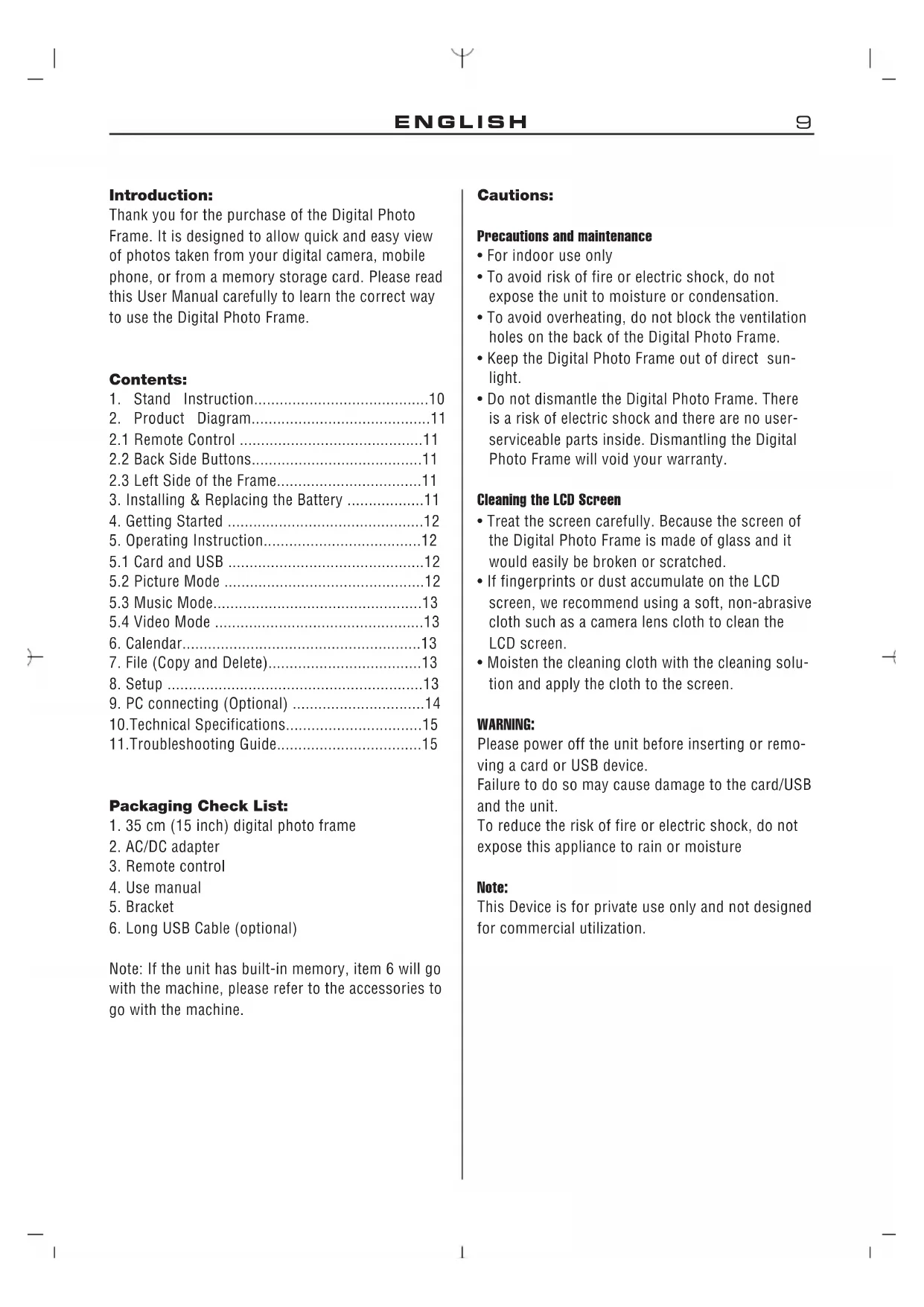 Introduction: Thank you for the purchase of the Digital Photo Frame. It is designed to allow quick and easy view of photos taken from your digital camera, mobile phone, or from a memory storage card. Please read this User Manual carefully to learn the correct way to use the Digital Photo Frame. Contents:
