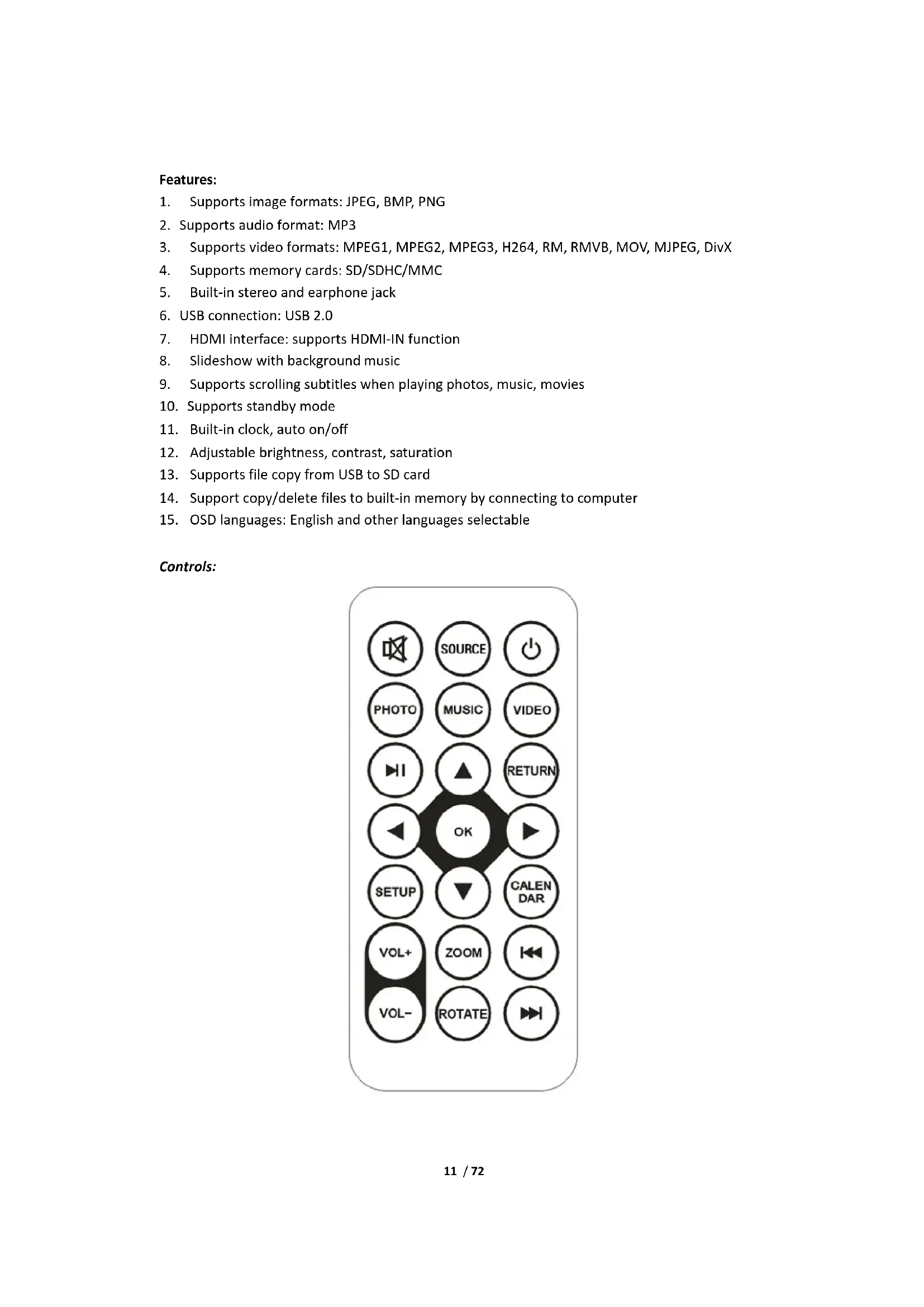 Confirmation SETUP Setup menu CALENDAR Calendar function directly VOL+ VOL- Volume adjustment ZOOM Enlarge the photo in photo play mode ROTATE Rotate the photo in photo play mode Select previous or next file Main Menu: Supports SD/SDHC/MMC and USB 2.0. Press to access photo, music, video, calendar and settings menus. Press OK button to confirm selection. Note: Make sure there are supported picture, music or video files on the memory card or USB device.13 / 72 Picture Mode: Highlight Photo from the main menu, press OK to select the USB or memory card for playback and press RETURN to access thumbnail mode. Press to select the photo for playback and press OK to confirm.