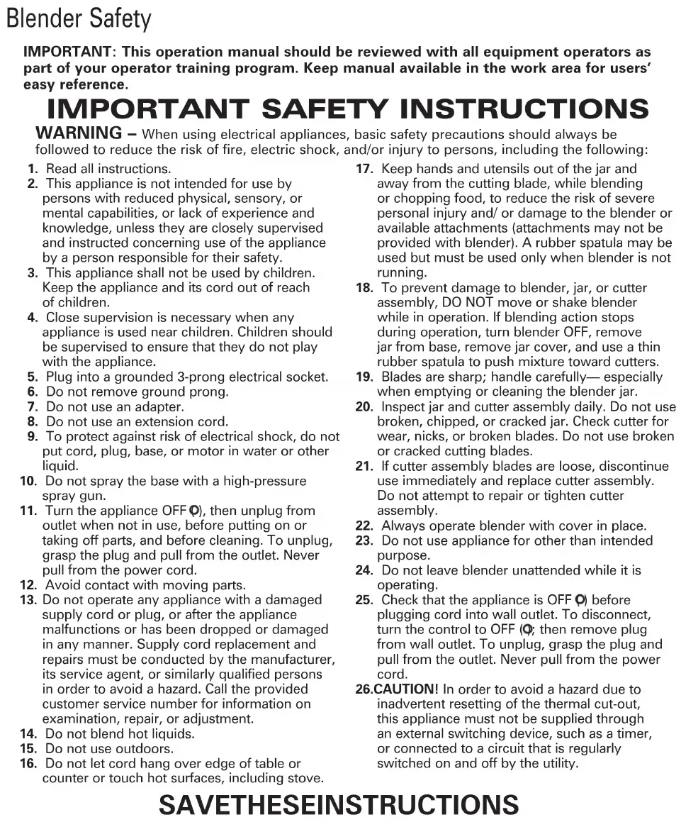 assembly, DO NOT move or shake blender while in operation. If blending action stops during operation, turn blender OFF, remove jar from base, remove jar cover, and use a thin rubber spatula to push mixture toward cutters.