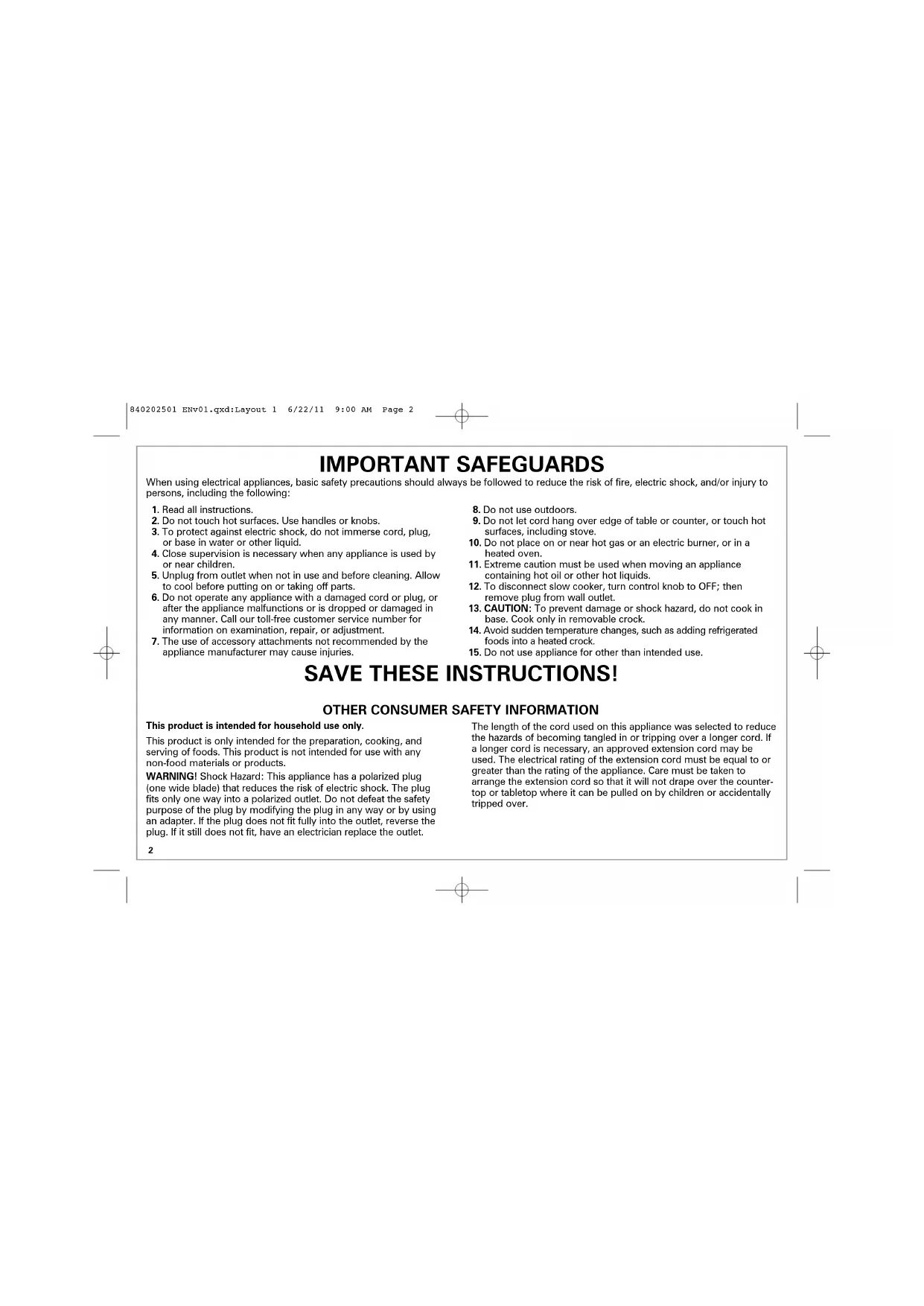 When using electrical appliances, basic safety precautions should always be followed to reduce the risk of fire, electric shock, and/or injury to persons, including the following: SAVE THESE INSTRUCTIONS! 840202501 ENv01.qxd:Layout 1 6/22/11 9:00 AM Page 23