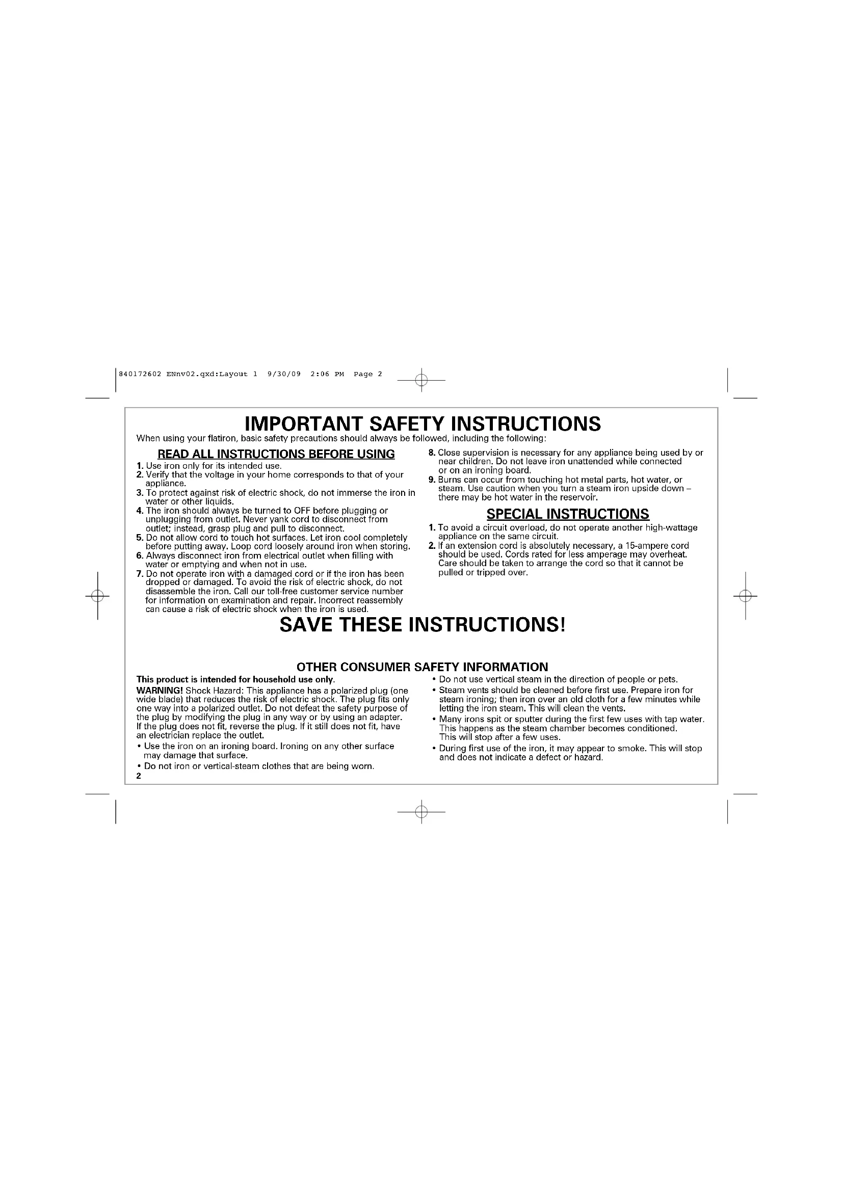 steam. Use caution when you turn a steam iron upside down – there may be hot water in the reservoir. SPECIAL INSTRUCTIONS
