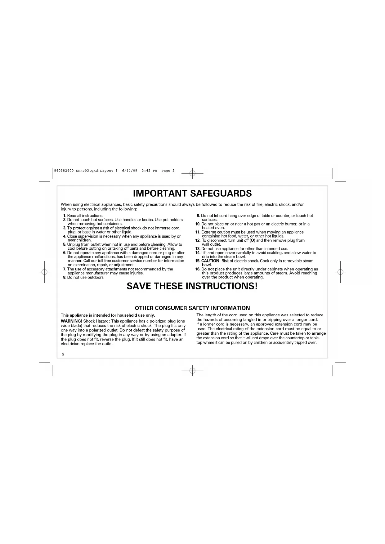 this product produces large amounts of steam. Avoid reaching over the product when operating. When using electrical appliances, basic safety precautions should always be followed to reduce the risk of fire, electric shock, and/or injury to persons, including the following: SAVE THESE INSTRUCTIONS!
